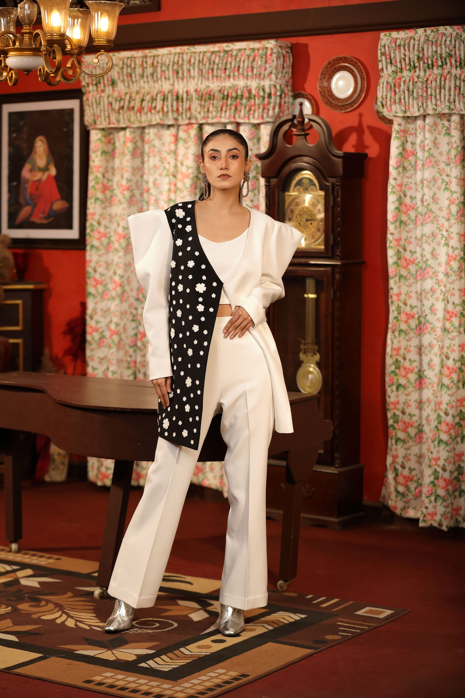 A striking black and white color-blocked design. This stunning dress features broad balloon sleeves that add volume to the shoulders, with beautiful cutwork floral detailing on the black side, creating a chic and sophisticated look. The textured fabric is good for all seasons