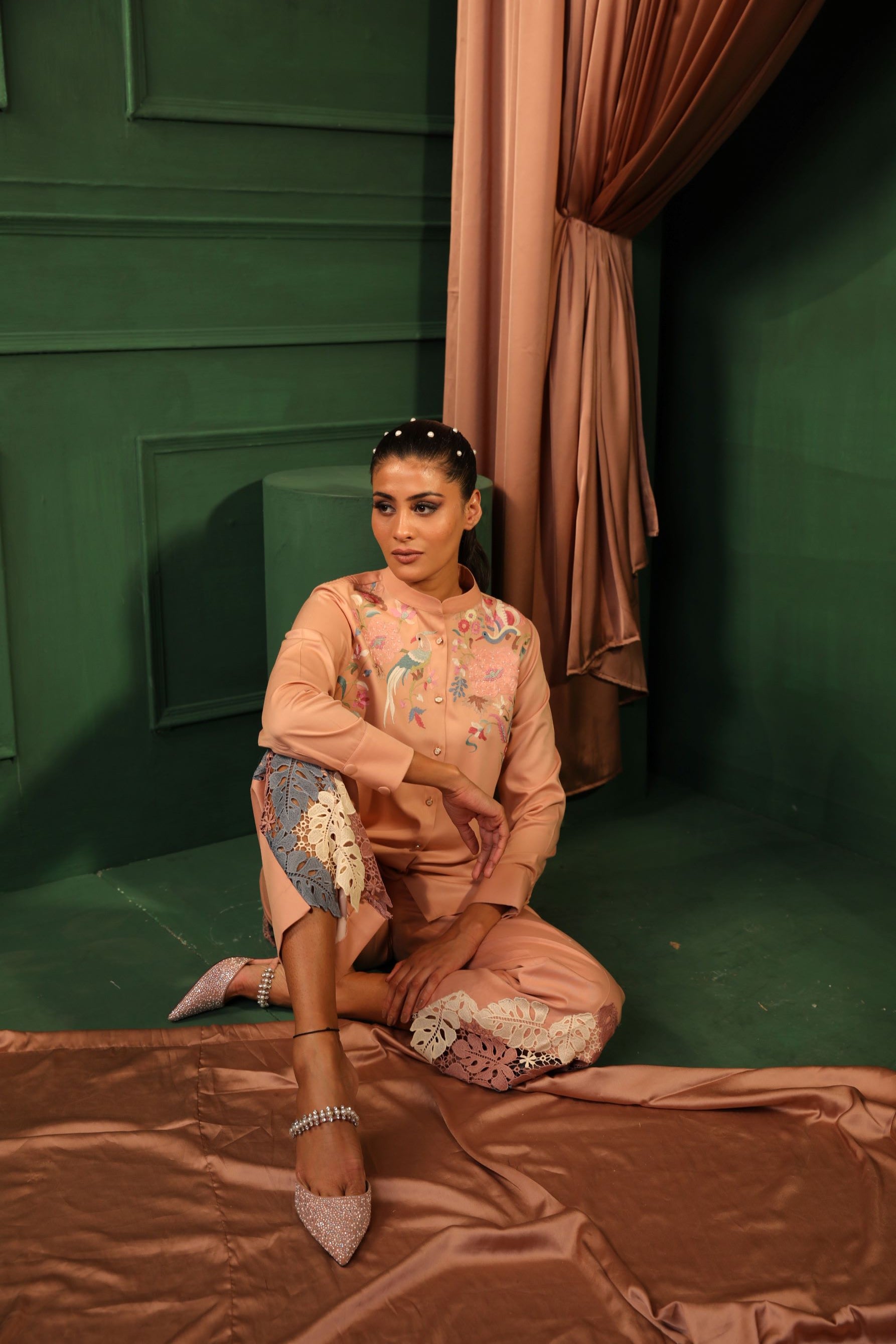The Blush Beauty ensemble is a soft, pastel dream. Its intricate hand and thread embroidery and comfortable fit make it perfect for both casual and formal settings. Elevate your wardrobe with this timeless piece.