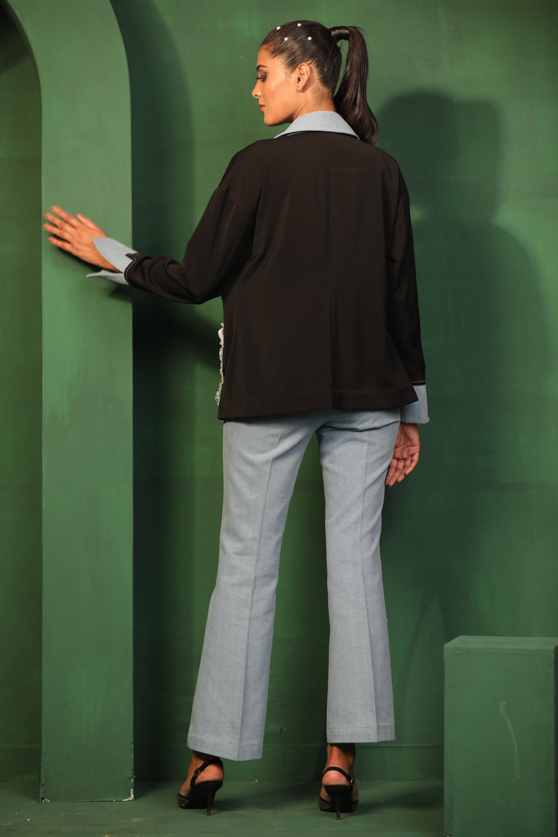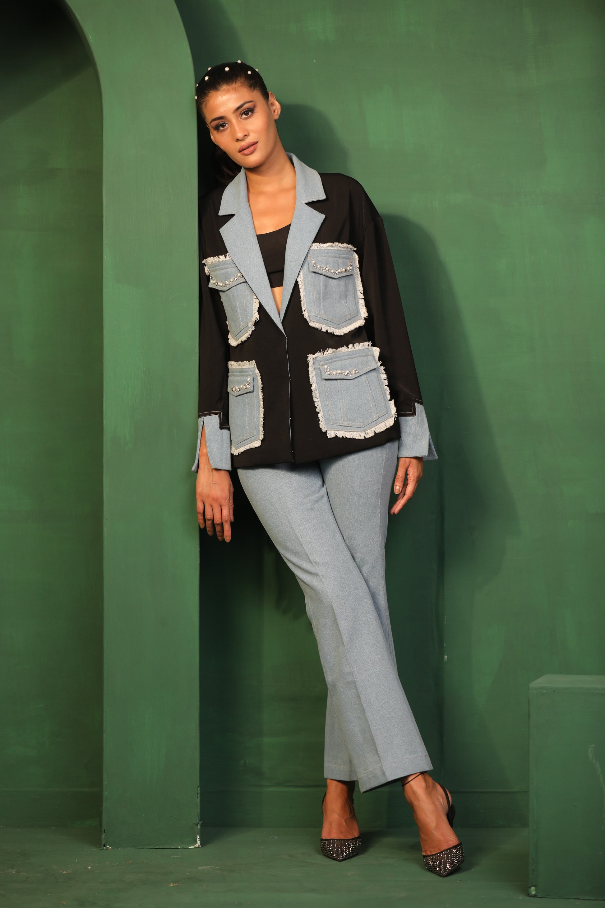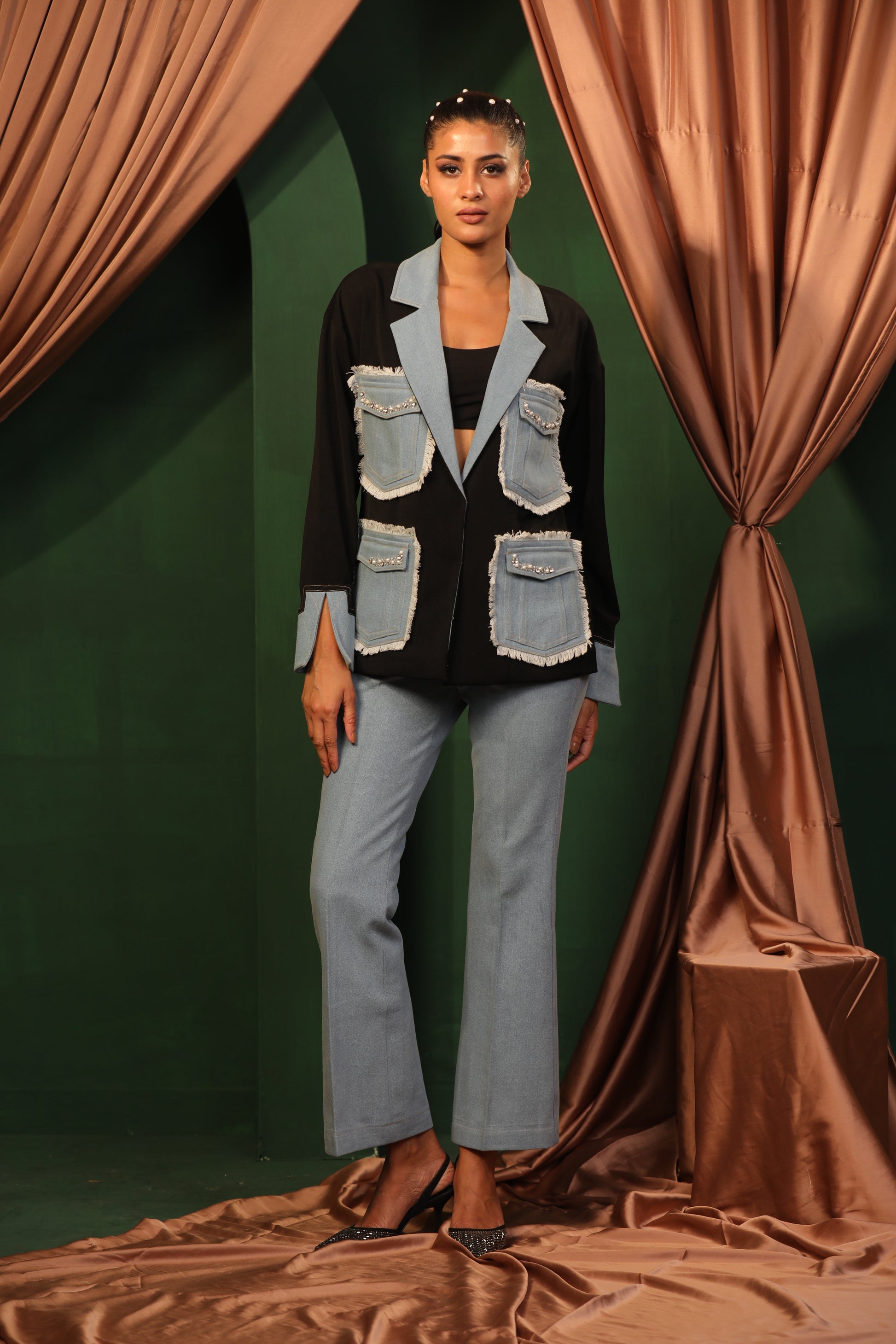 The Chic Contrast outfit adorned with crystals and pearls features a stylish top with bold patchwork paired with sleek denim pants. It's a versatile set that can be dressed up or down. Perfect for making a statement.