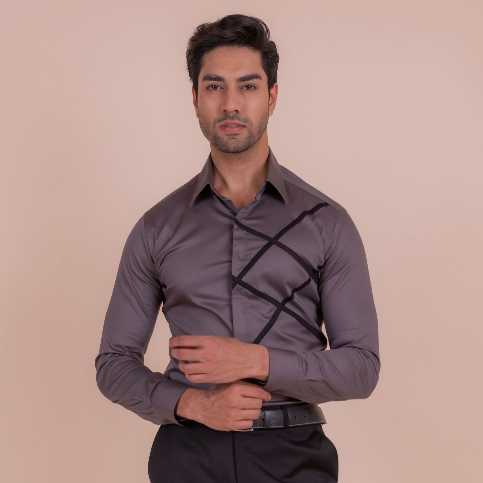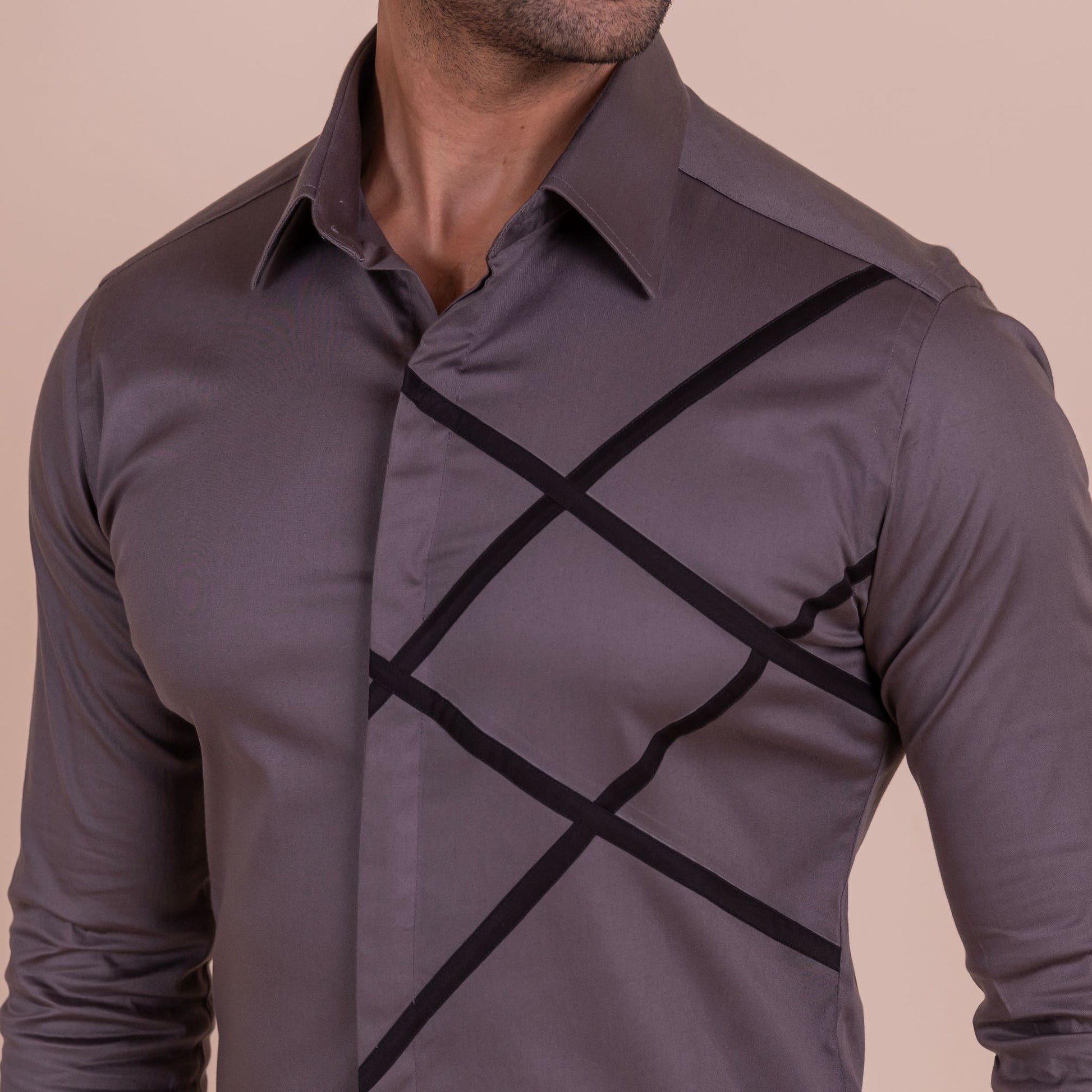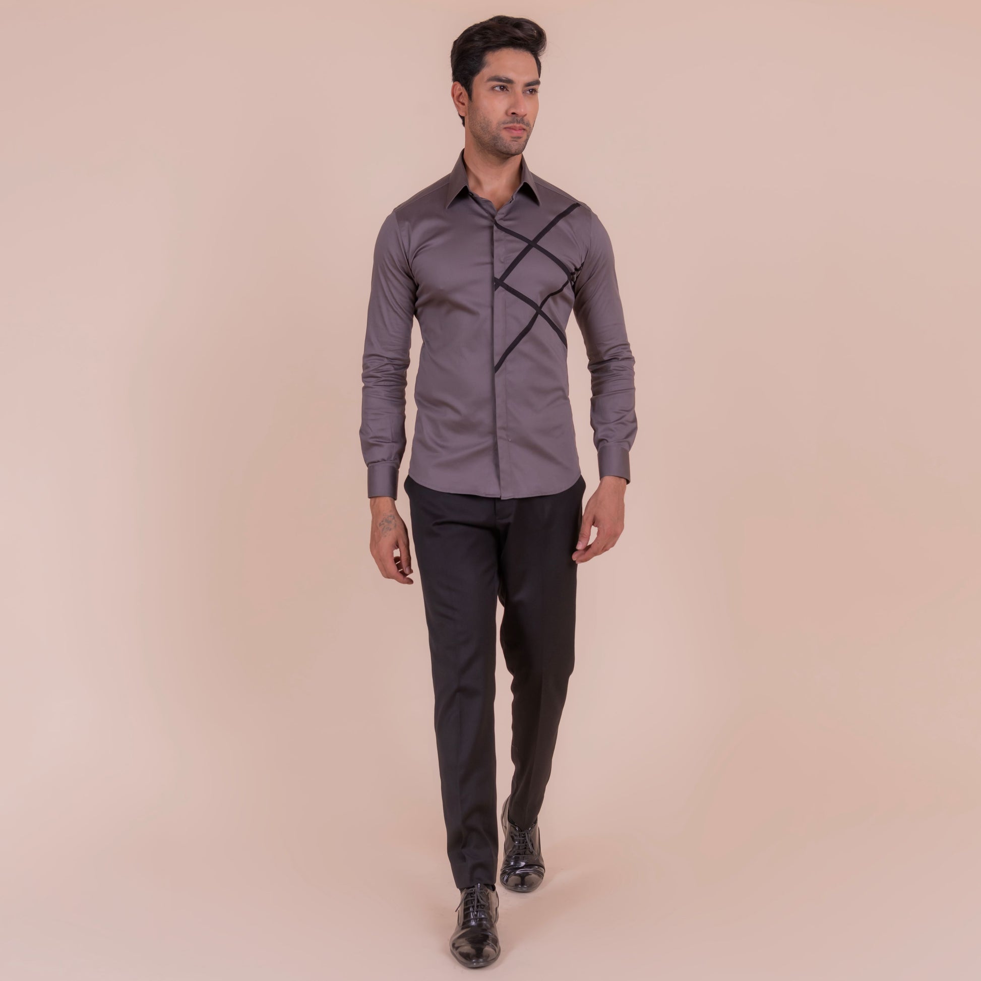 Make a stylish statement with this grey shirt, featuring black cross detailing that adds a touch of edge to your look. The contrasting colors and slim fit design make it perfect for casual wear.