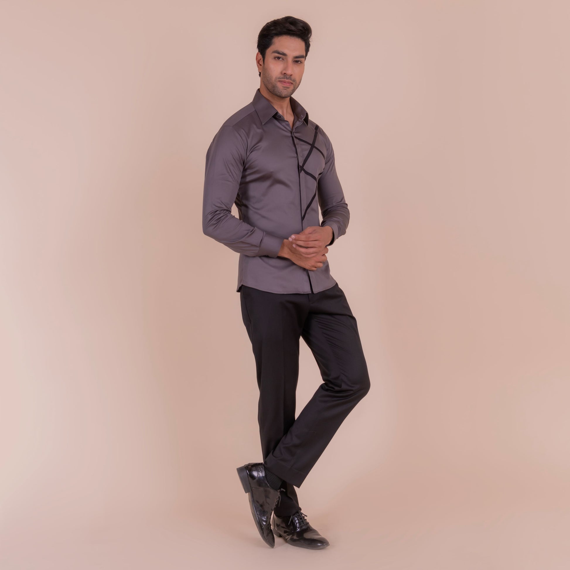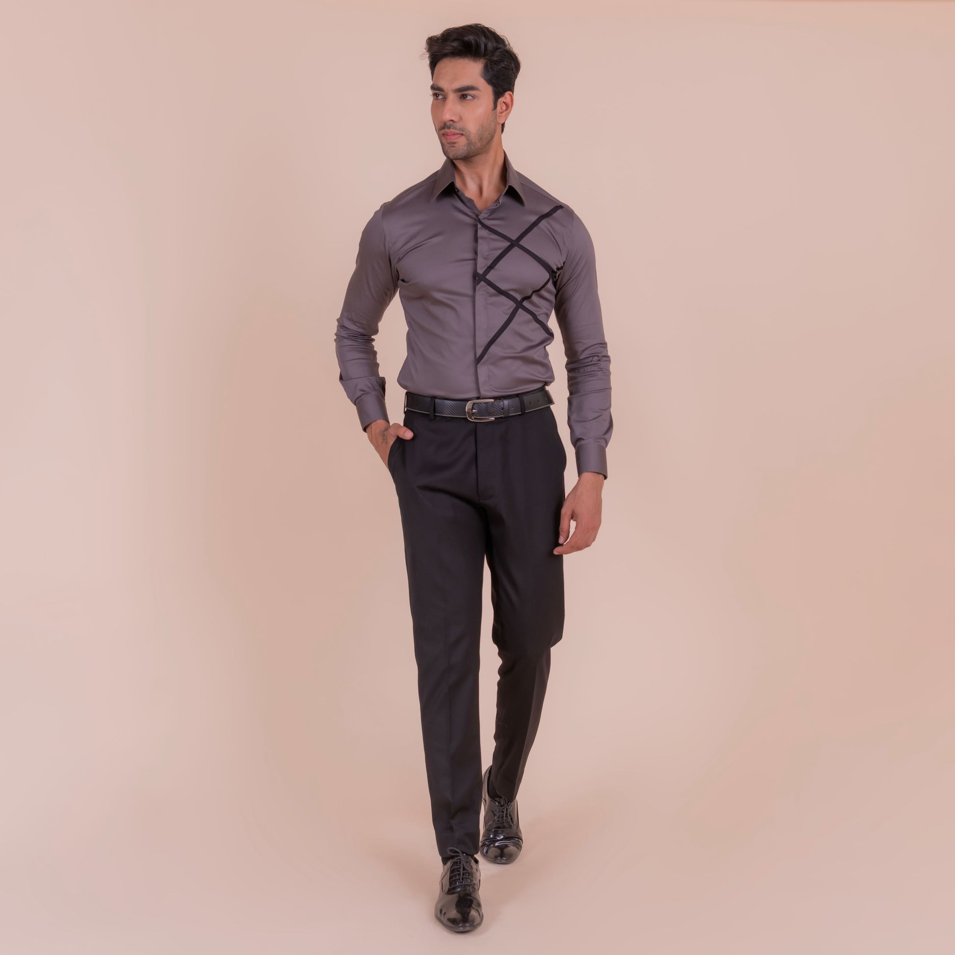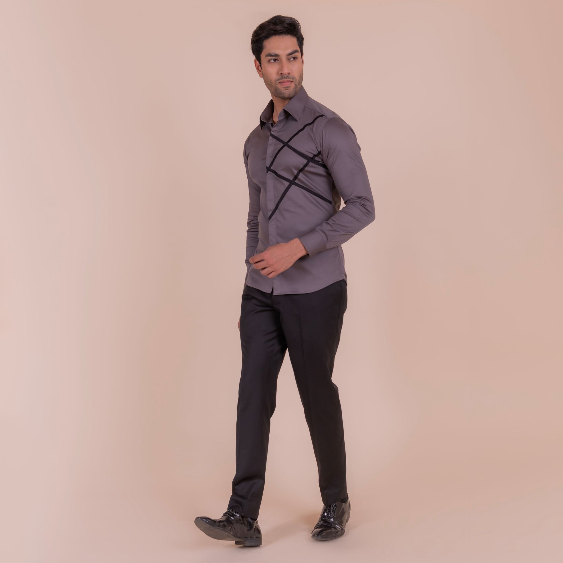 Make a stylish statement with this grey shirt, featuring black cross detailing that adds a touch of edge to your look. The contrasting colors and slim fit design make it perfect for casual wear.