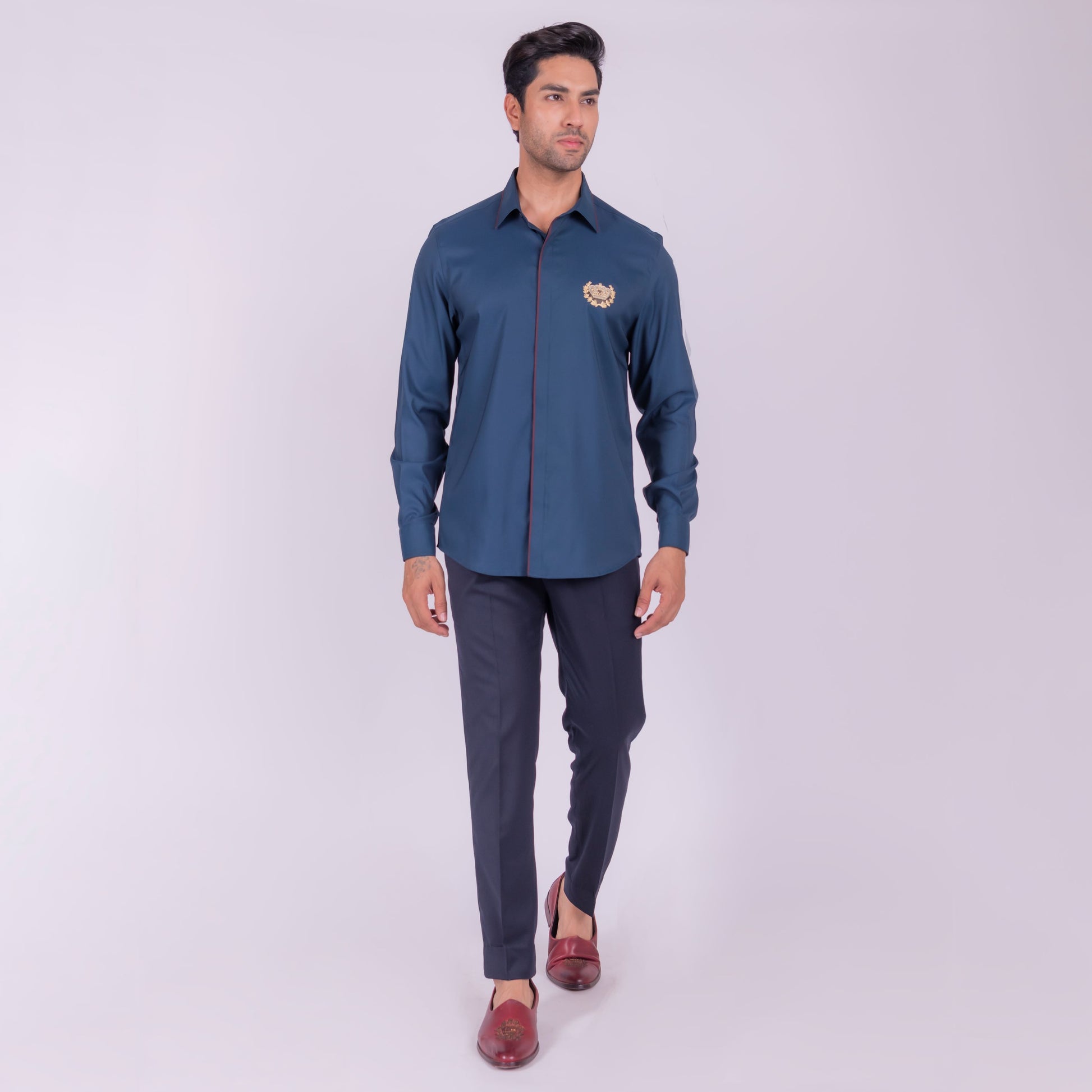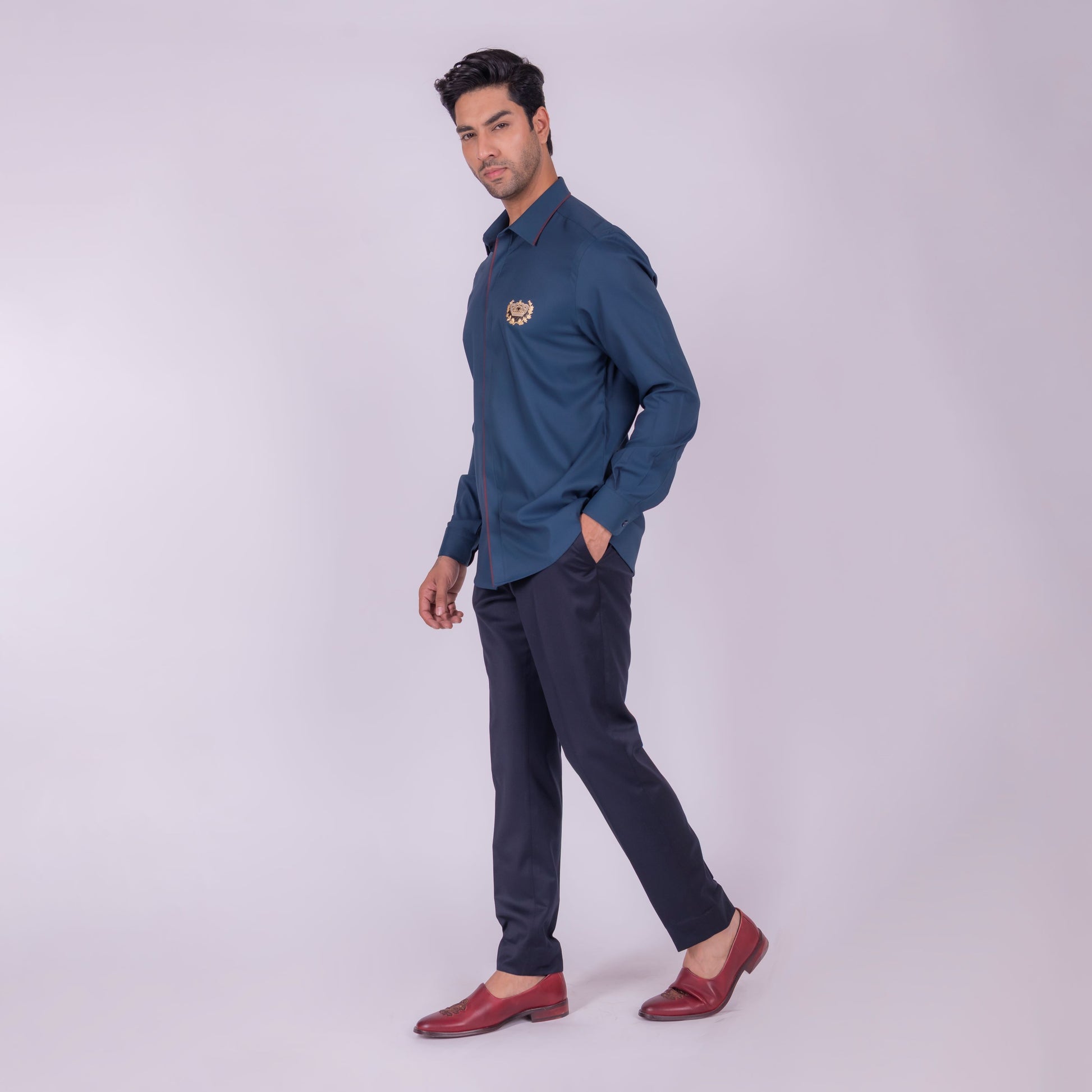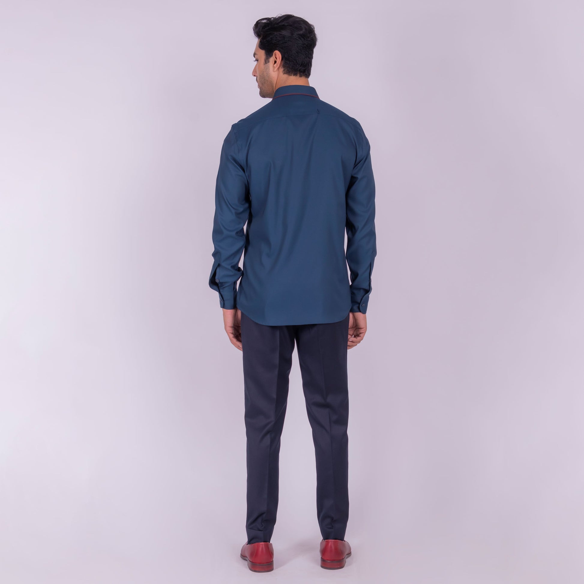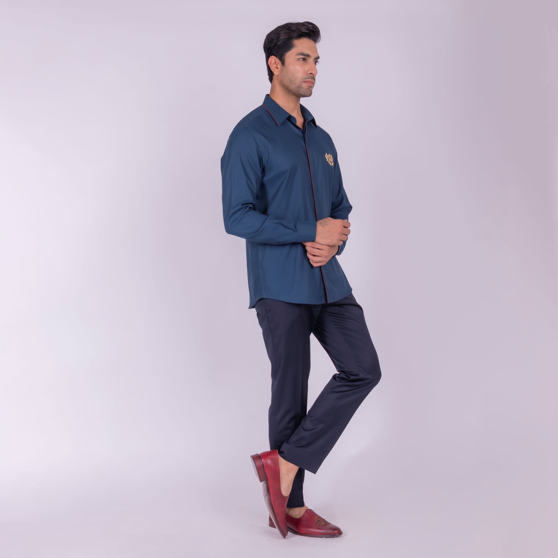 Add a touch of warmth and elegance to your outfit with this blue shirt, featuring a subtle motif and sleek red piping detailing. The unique color combination makes it perfect for formal events.