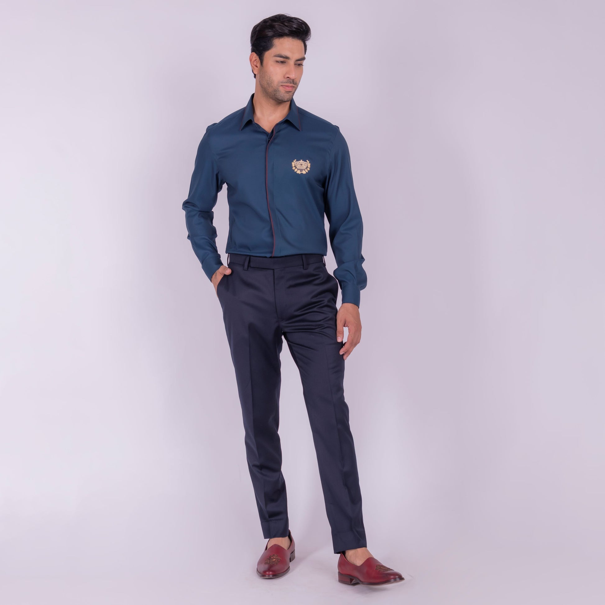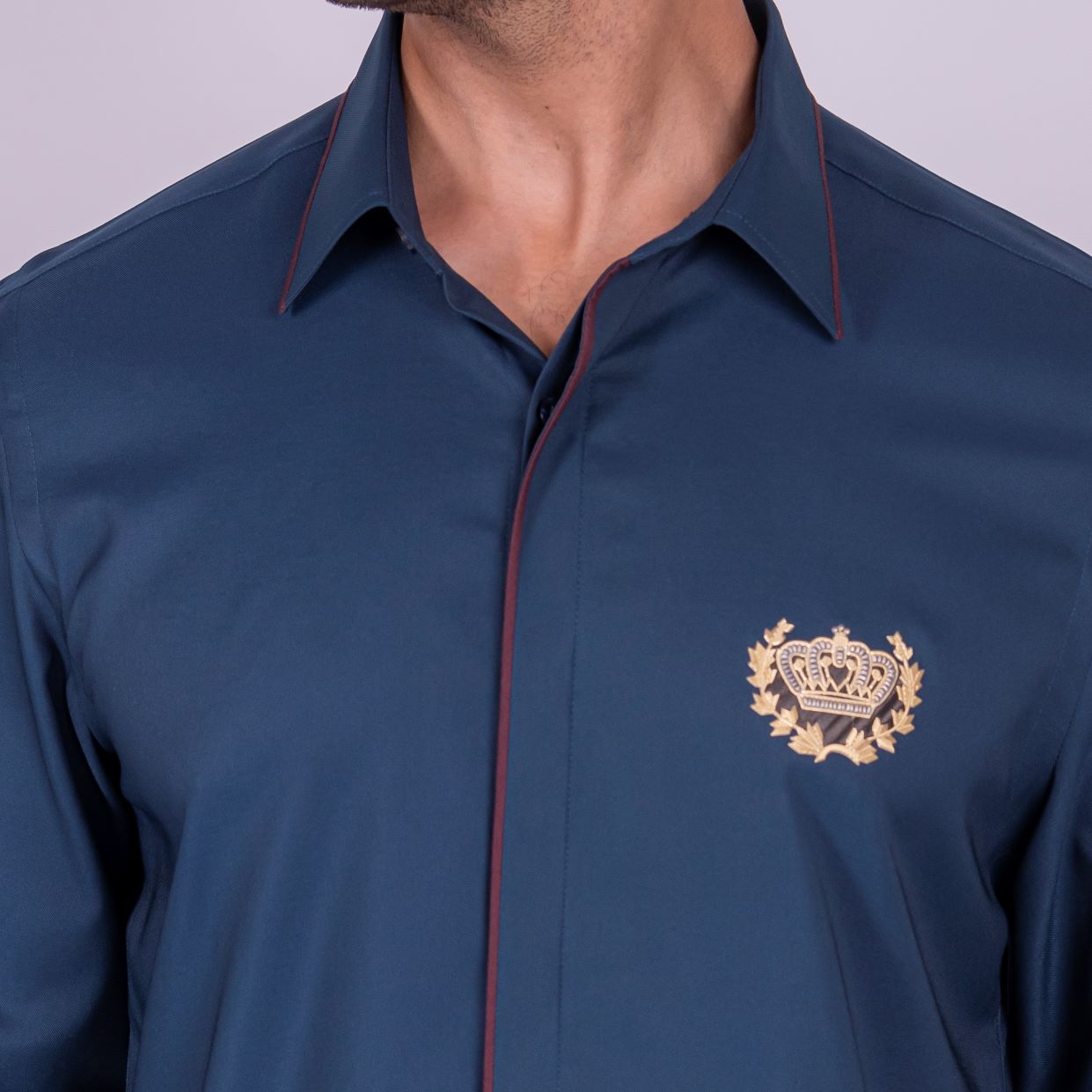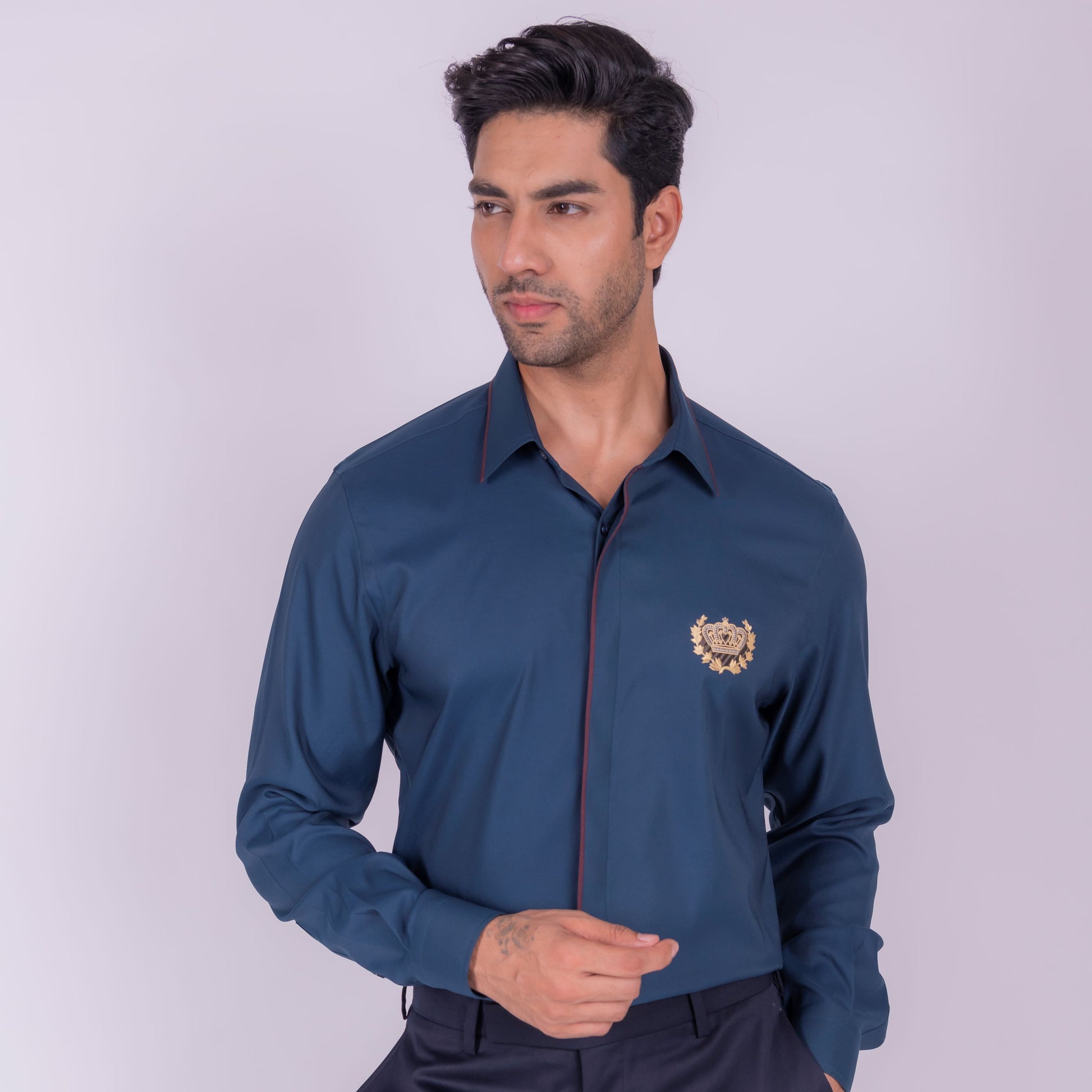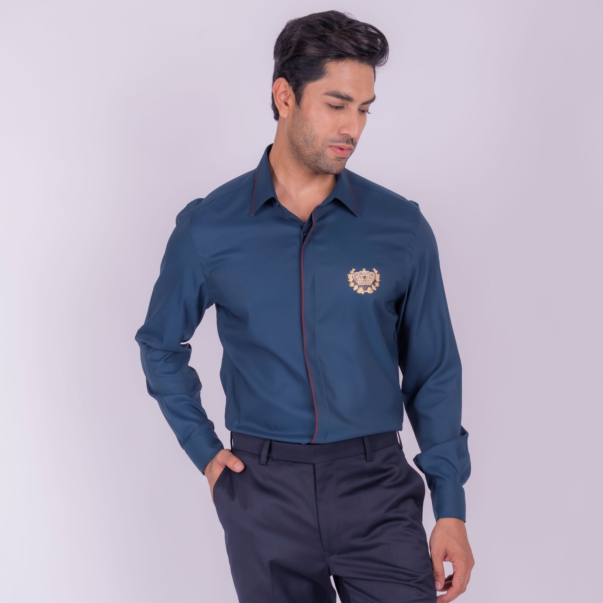 Add a touch of warmth and elegance to your outfit with this blue shirt, featuring a subtle motif and sleek red piping detailing. The unique color combination makes it perfect for formal events.