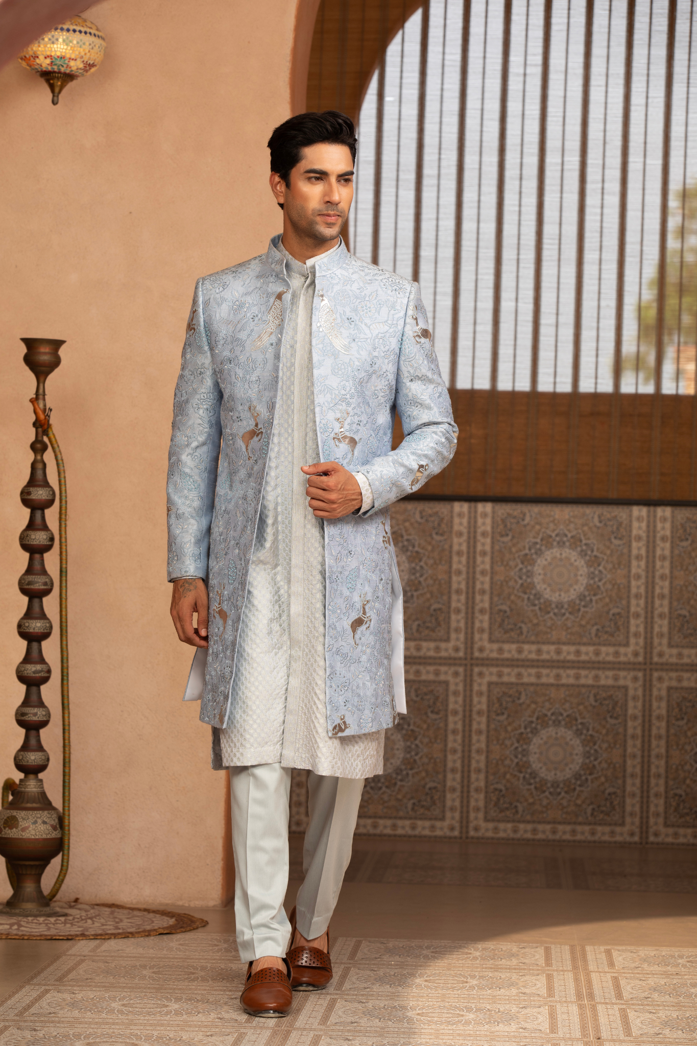 This elegant pastel blue Indo-Western ensemble features a finely embroidered long jacket adorned with subtle motifs, layered over a textured kurta and straight trousers. The refined detailing and tailored fit make it a perfect choice for weddings, receptions, or formal festivities, exuding regal sophistication and contemporary style