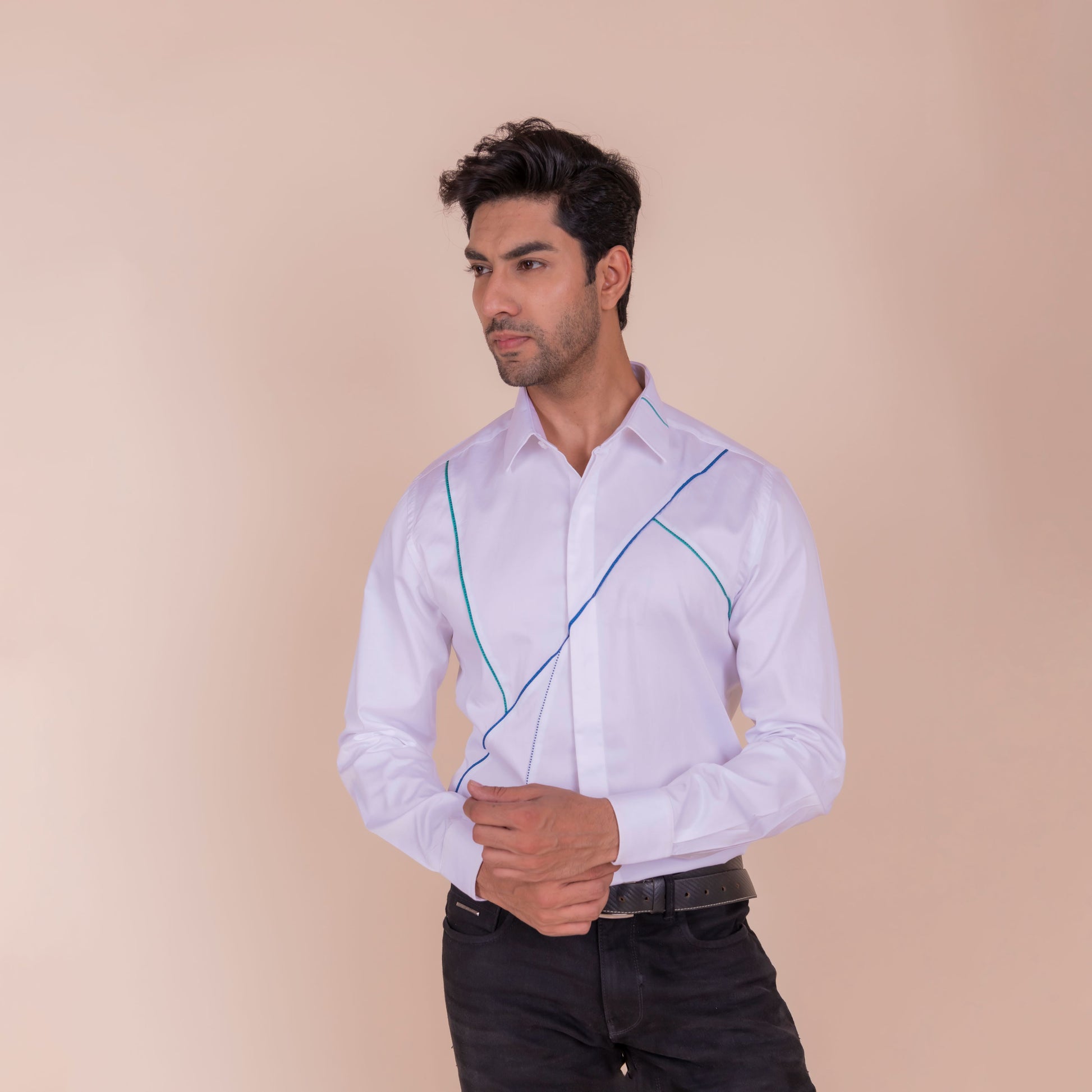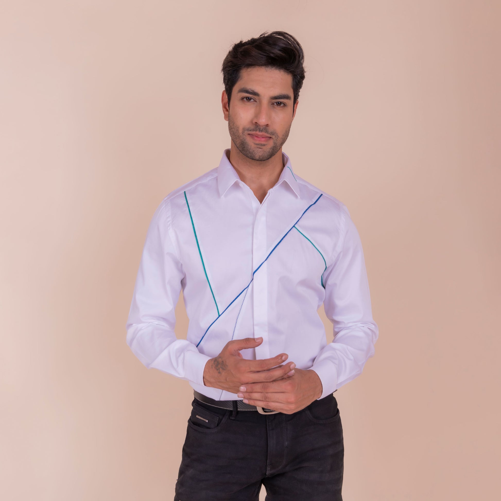 Stand out with our Geometric Grace Shirt, featuring stylish geometric lines that offer a contemporary twist to a classic white shirt. Perfect for those who like to blend traditional and modern styles.
