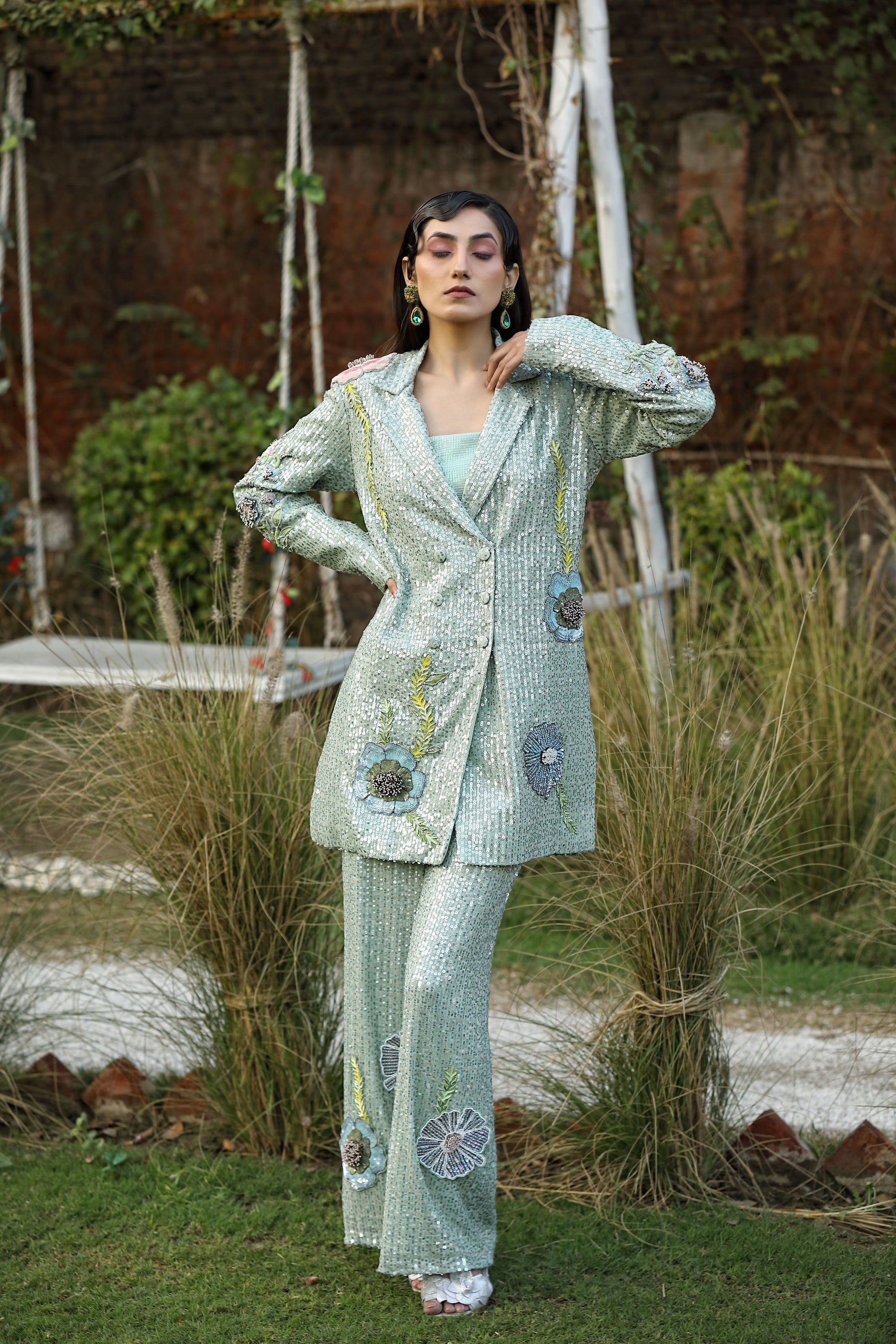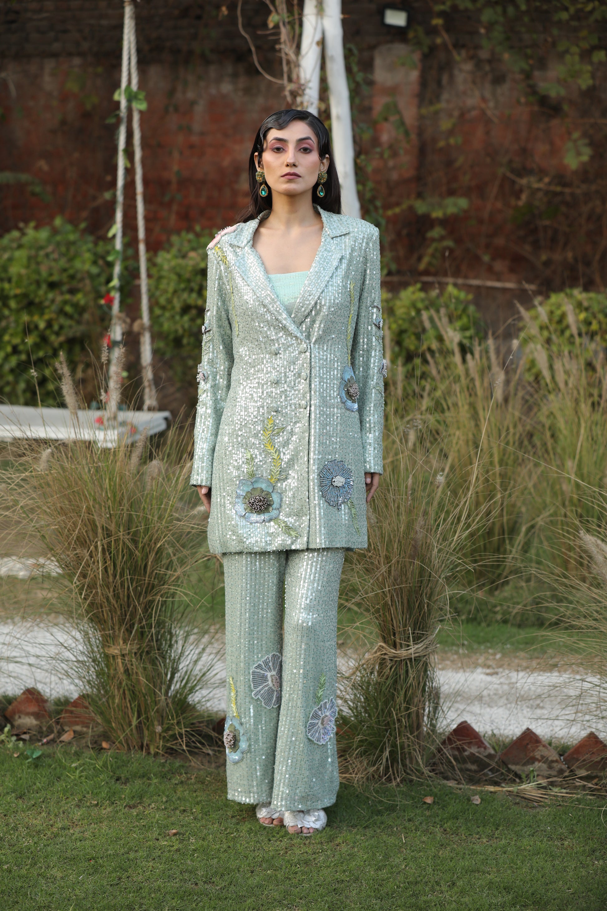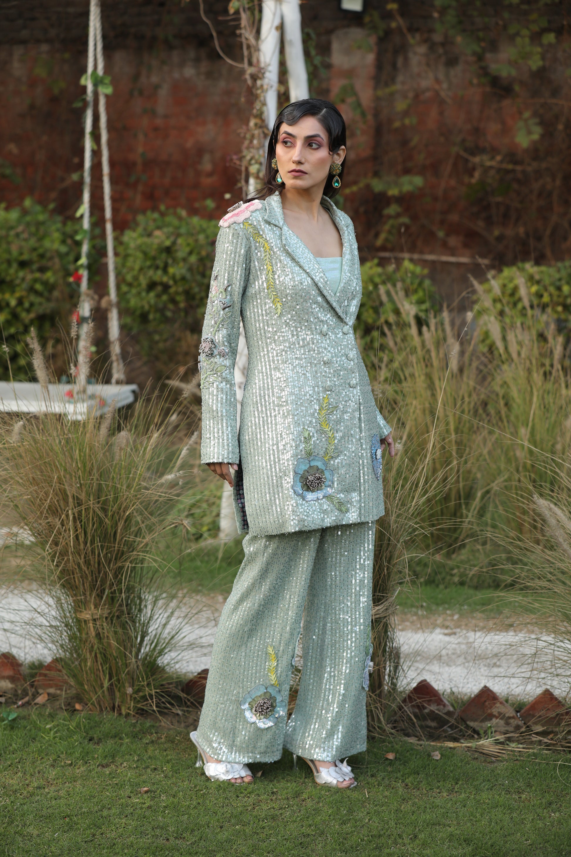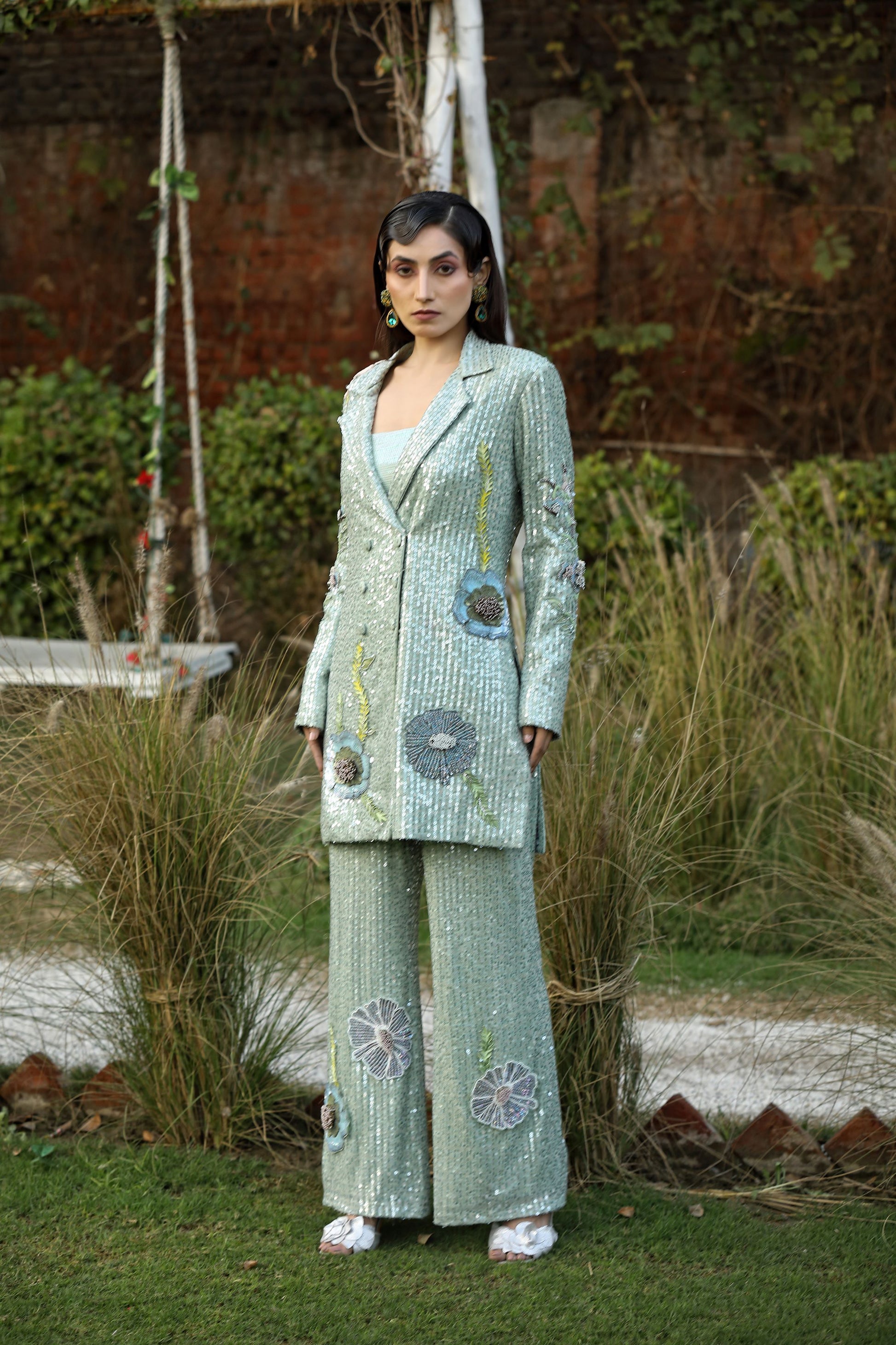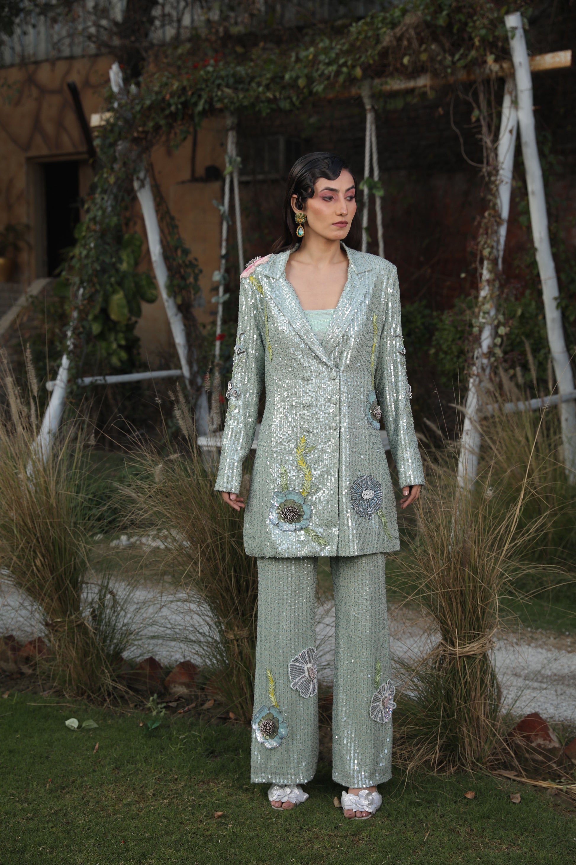 A mesmerizing ensemble adorned with Swarovski crystals and delicate floral hand detailing. This stunning sequence Western outfit features a long V-neck and collar, perfect for making a radiant statement.
