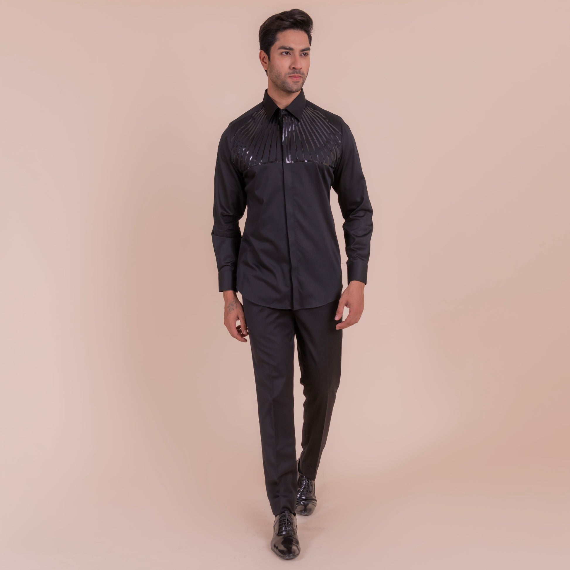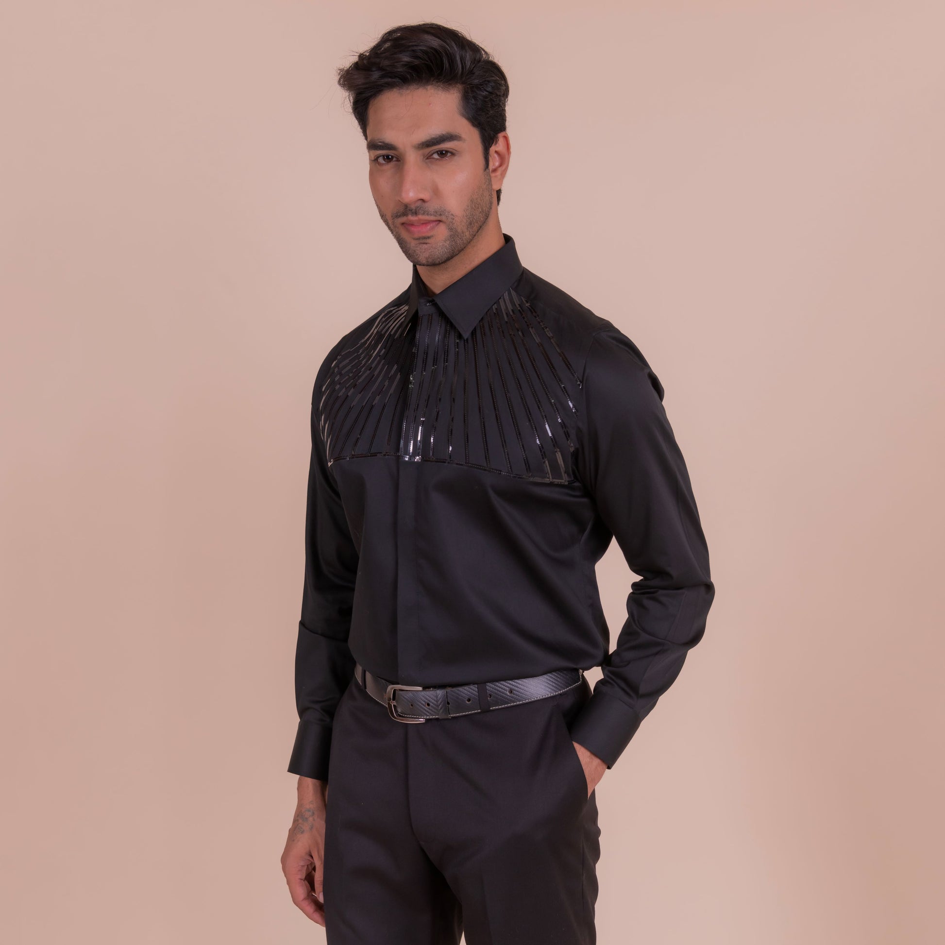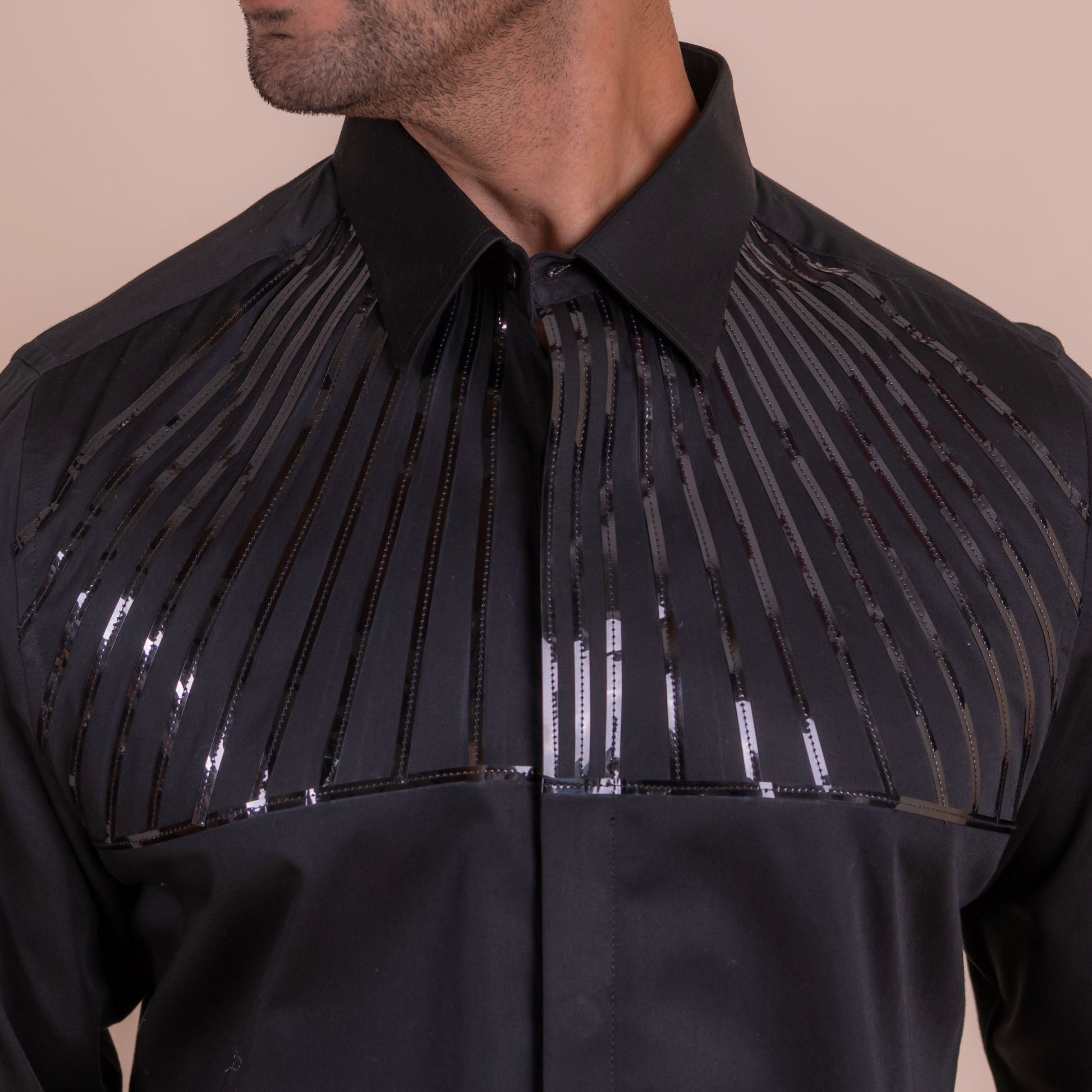 Make a bold statement with the lineage, a black shirt featuring sleek tape lines detailing on the upper half. This edgy and modern design adds a touch of rebellion to any outfit, perfect for those who dare to be different.