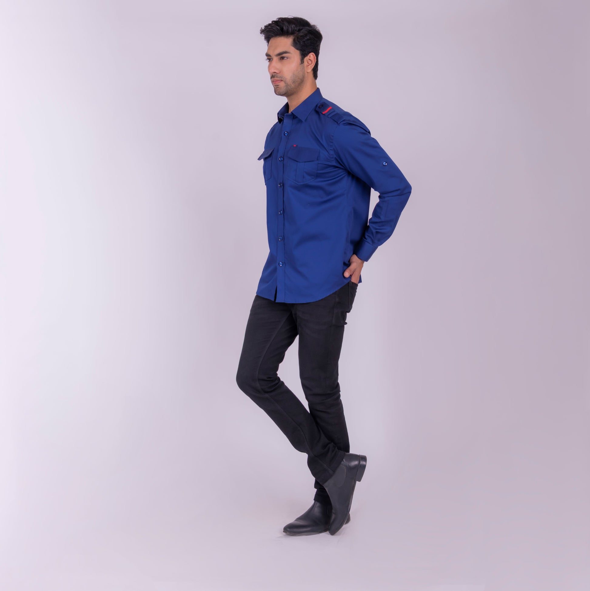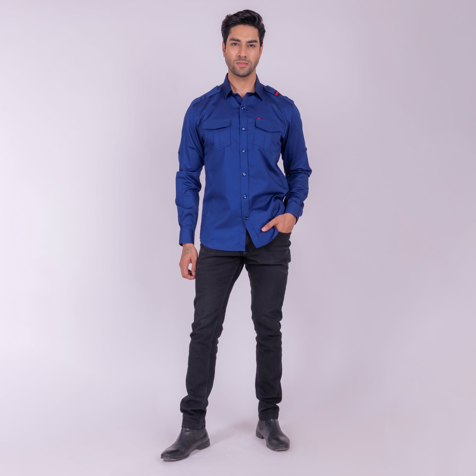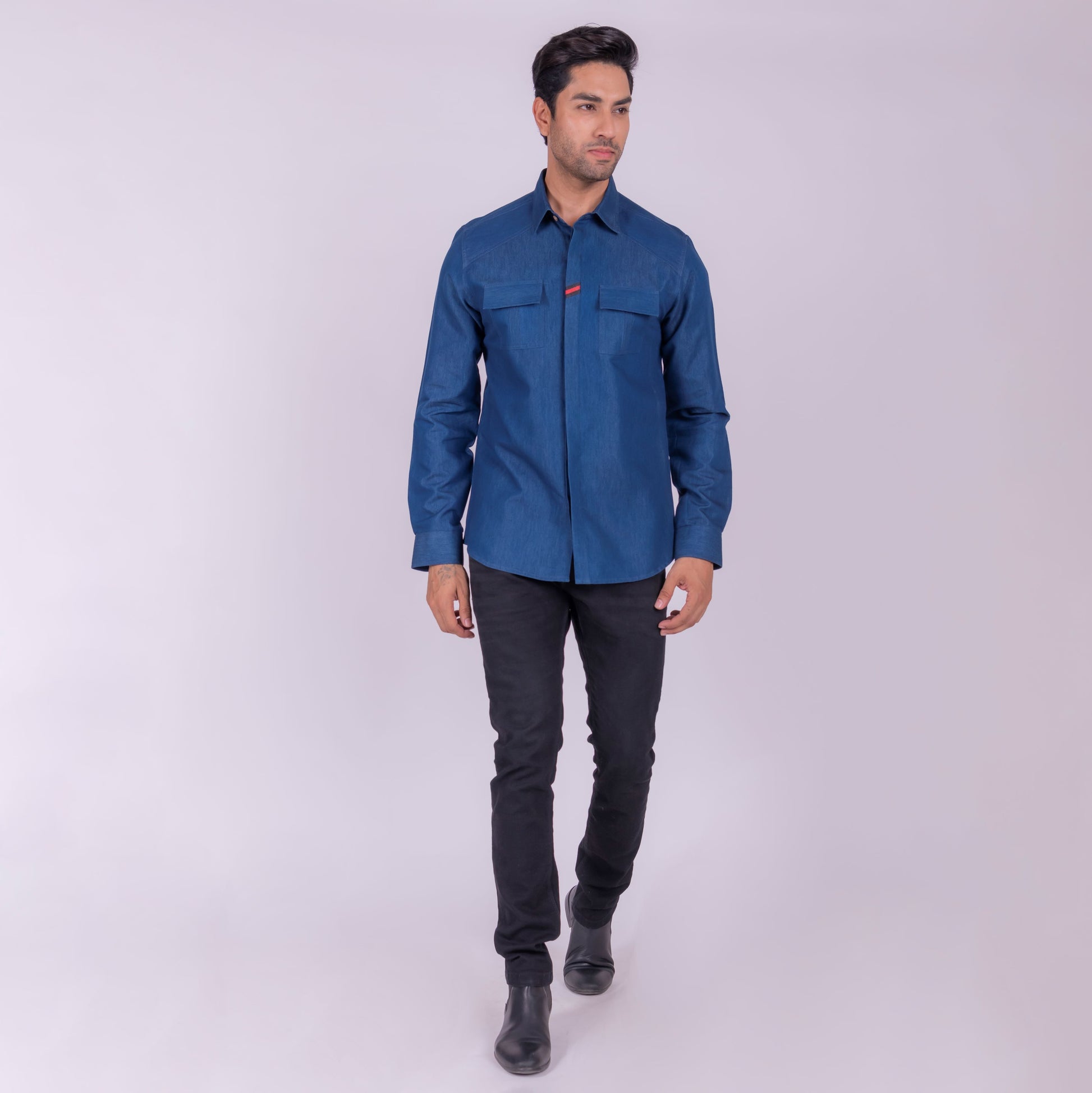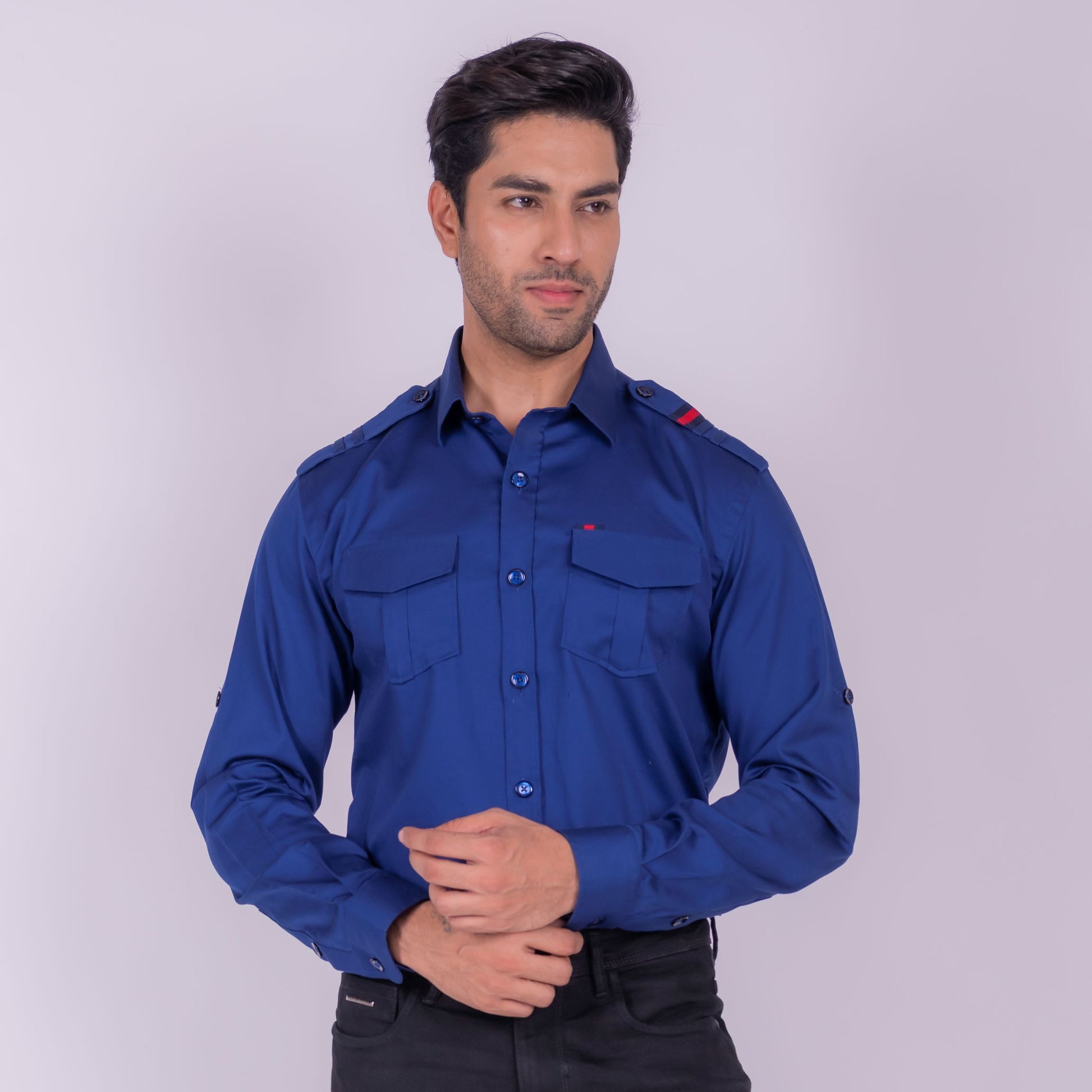 Embrace your adventurous side with this blue shirt, featuring functional pockets and a rugged design. The premium fabric and unique features make it perfect for outdoor activities.