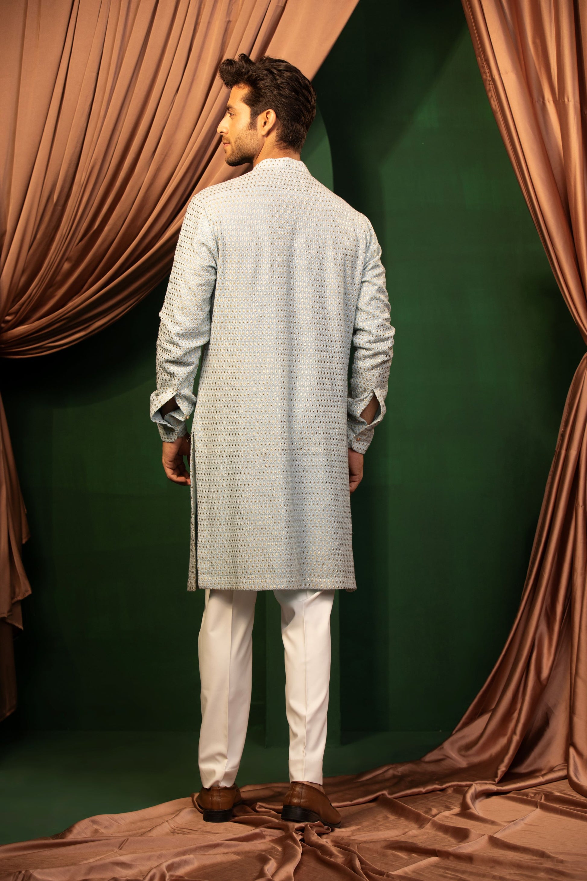 The Serene Sky Kurta Set in light blue exudes calmness and charm. Perfect for daytime events, this set pairs beautifully with traditional accessories.
