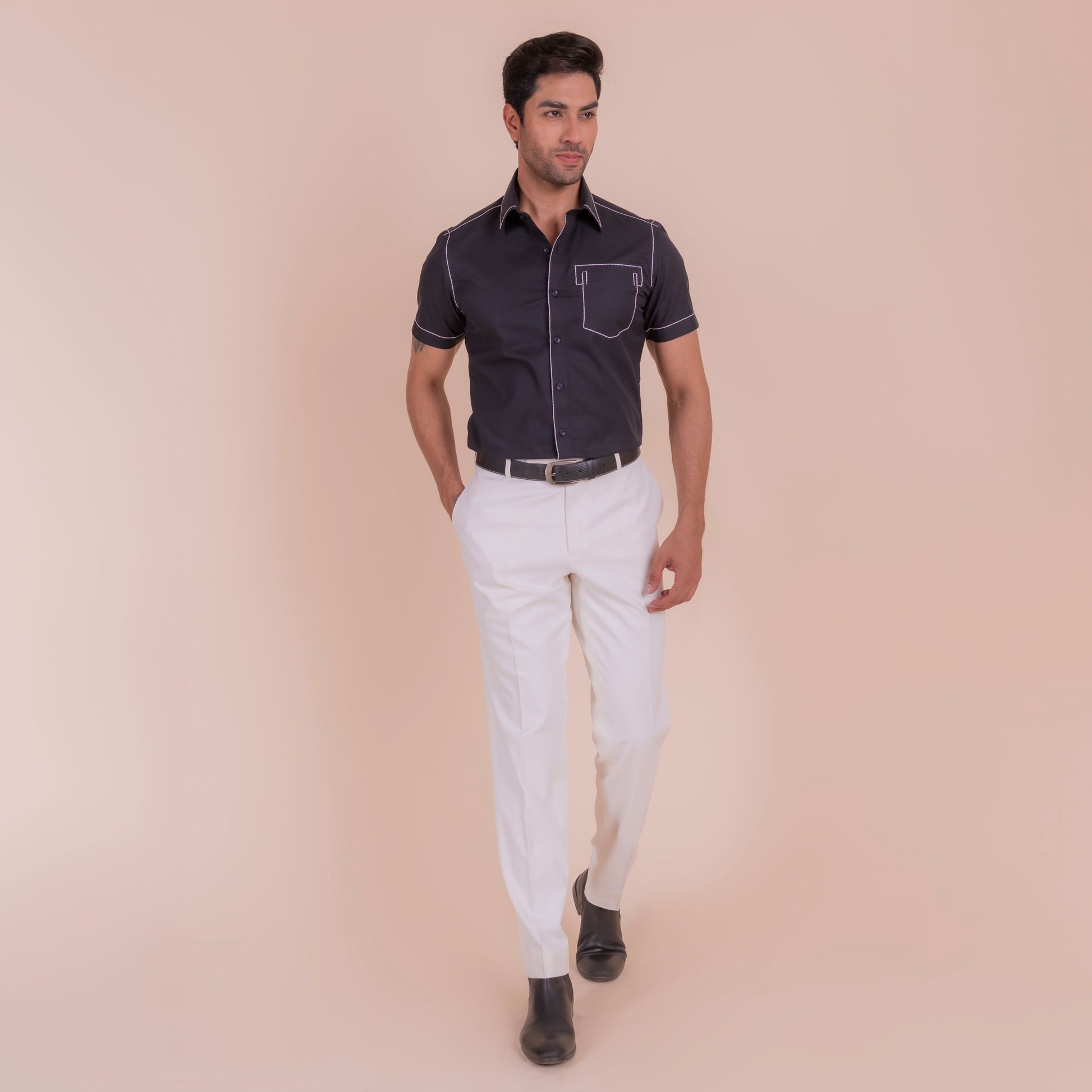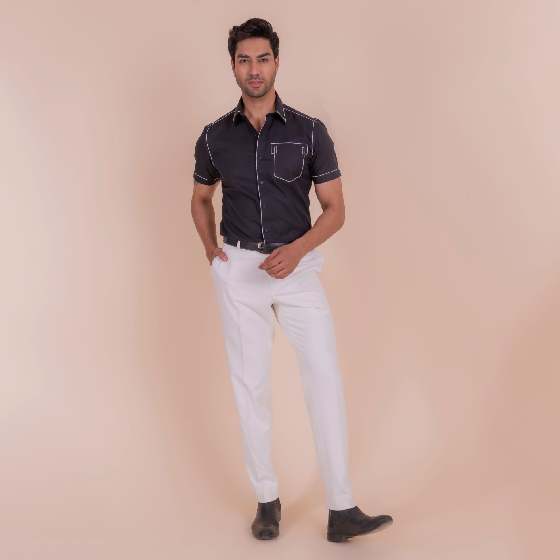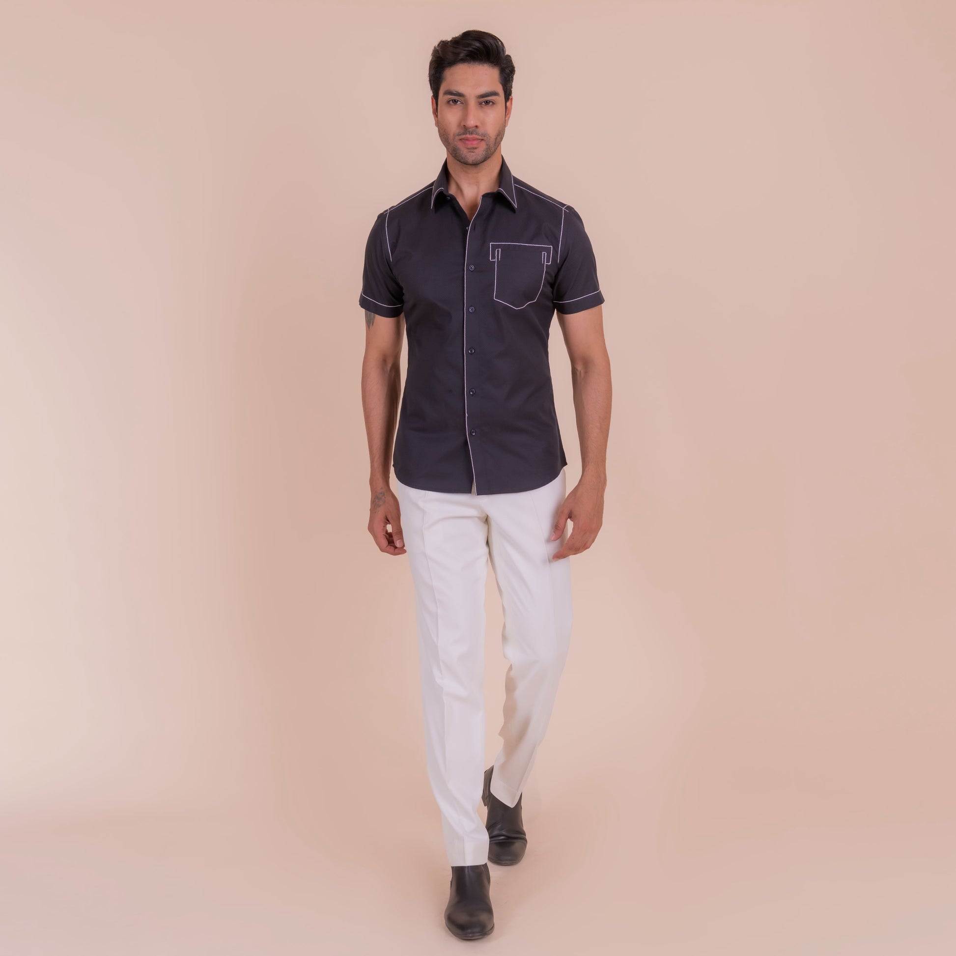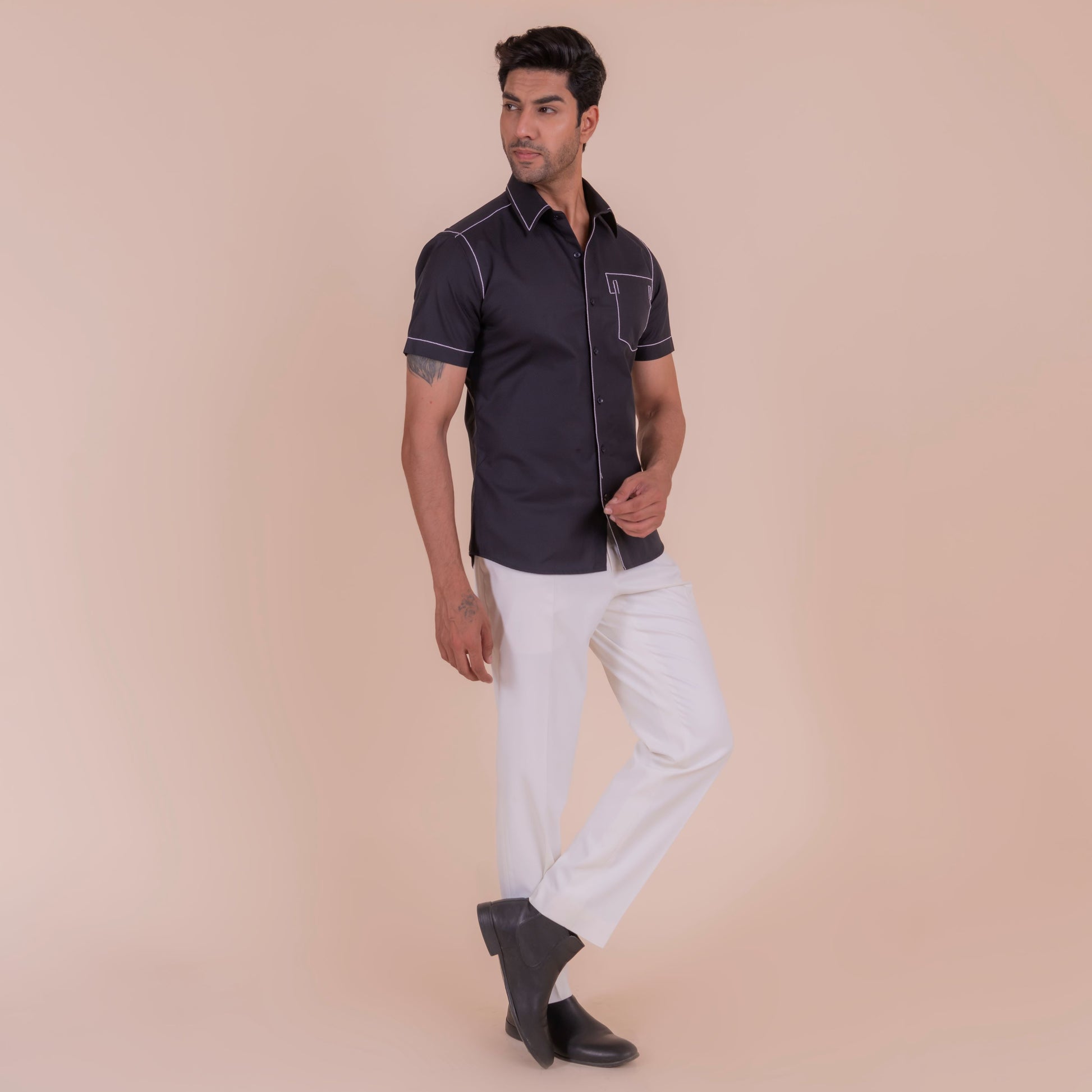 Make a bold statement with the Sharp Contrast Shirt. The black shirt with contrasting white stitching is perfect for those who appreciate modern, edgy designs. Ideal for both work and evening outings.