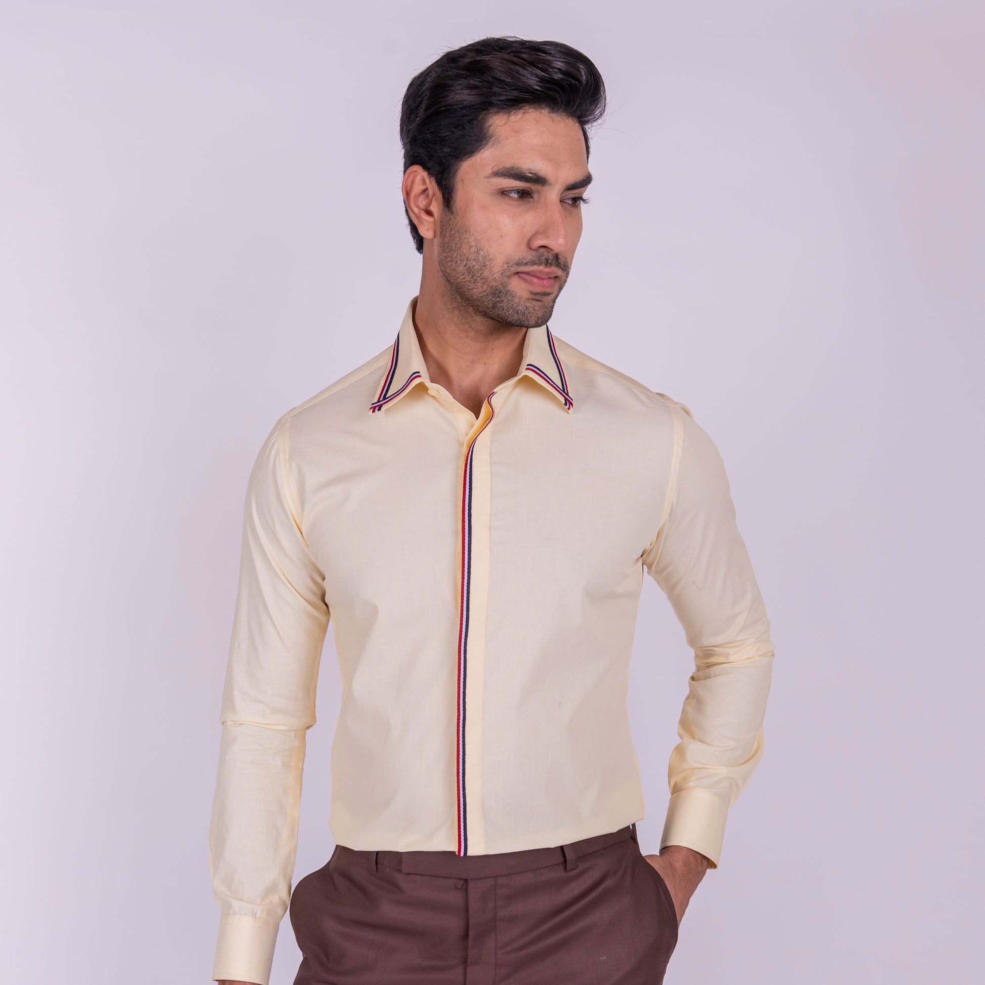 Brighten up your wardrobe with this vibrant lemon shirt, featuring a sleek border in red and blue that radiates luxury and style. The unique color combination makes it perfect for formal events.
