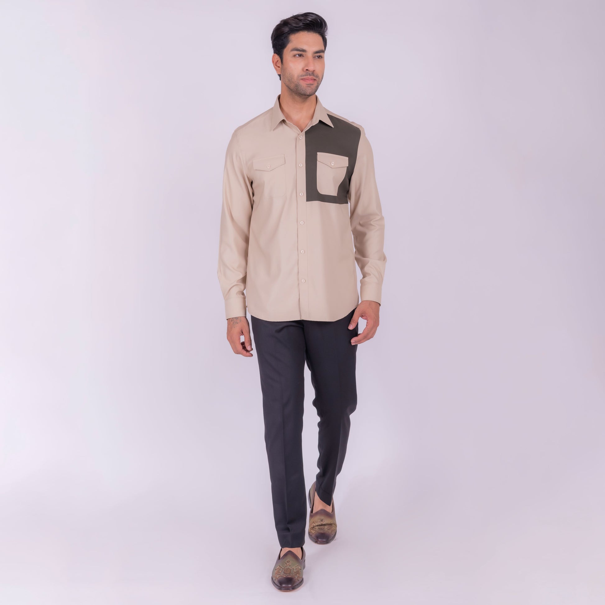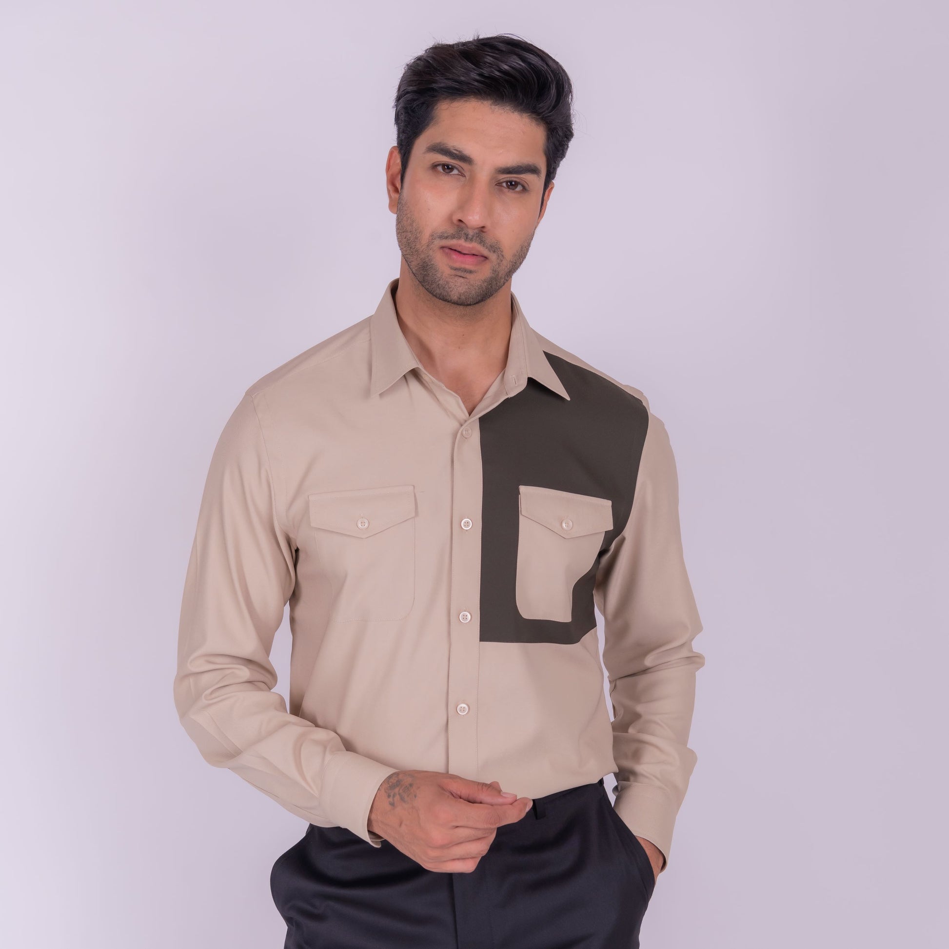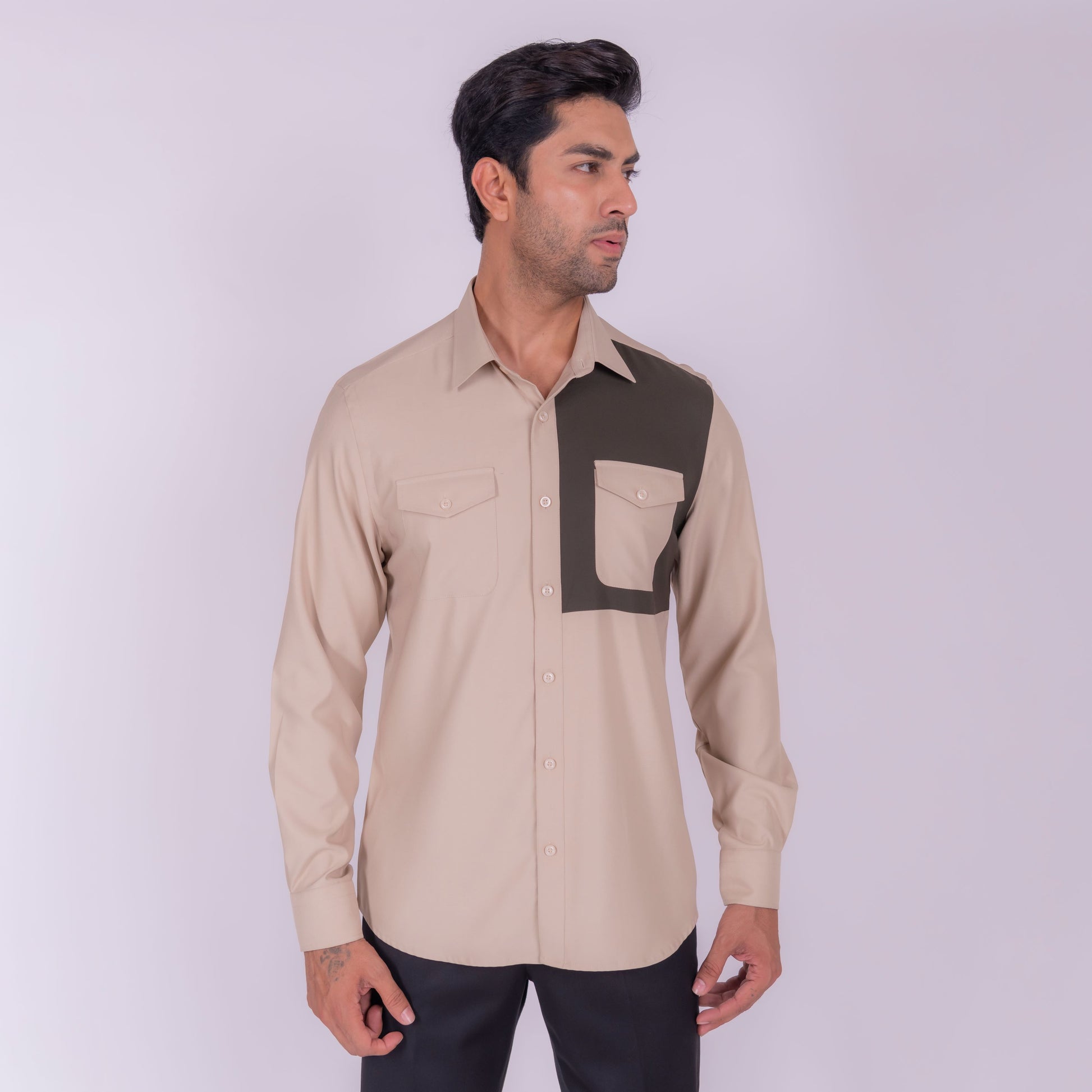 A harmonious blend of earthy tones, this beige shirt with olive green detailing is perfect for those who appreciate a natural and effortless style. The combination of colors creates a soothing and calming visual appeal.