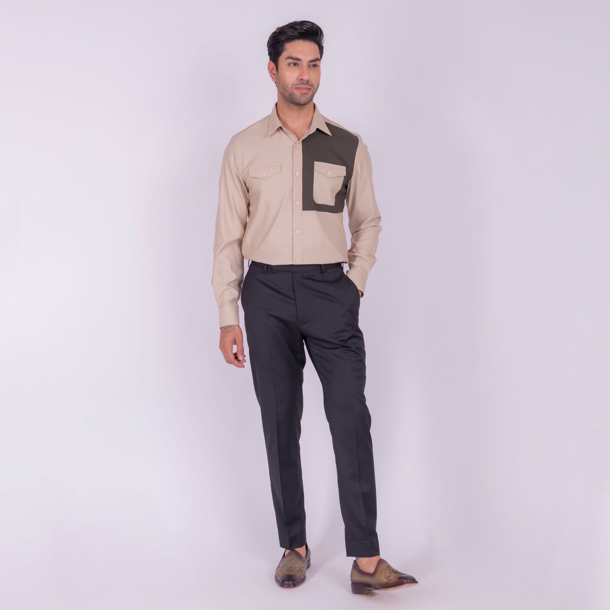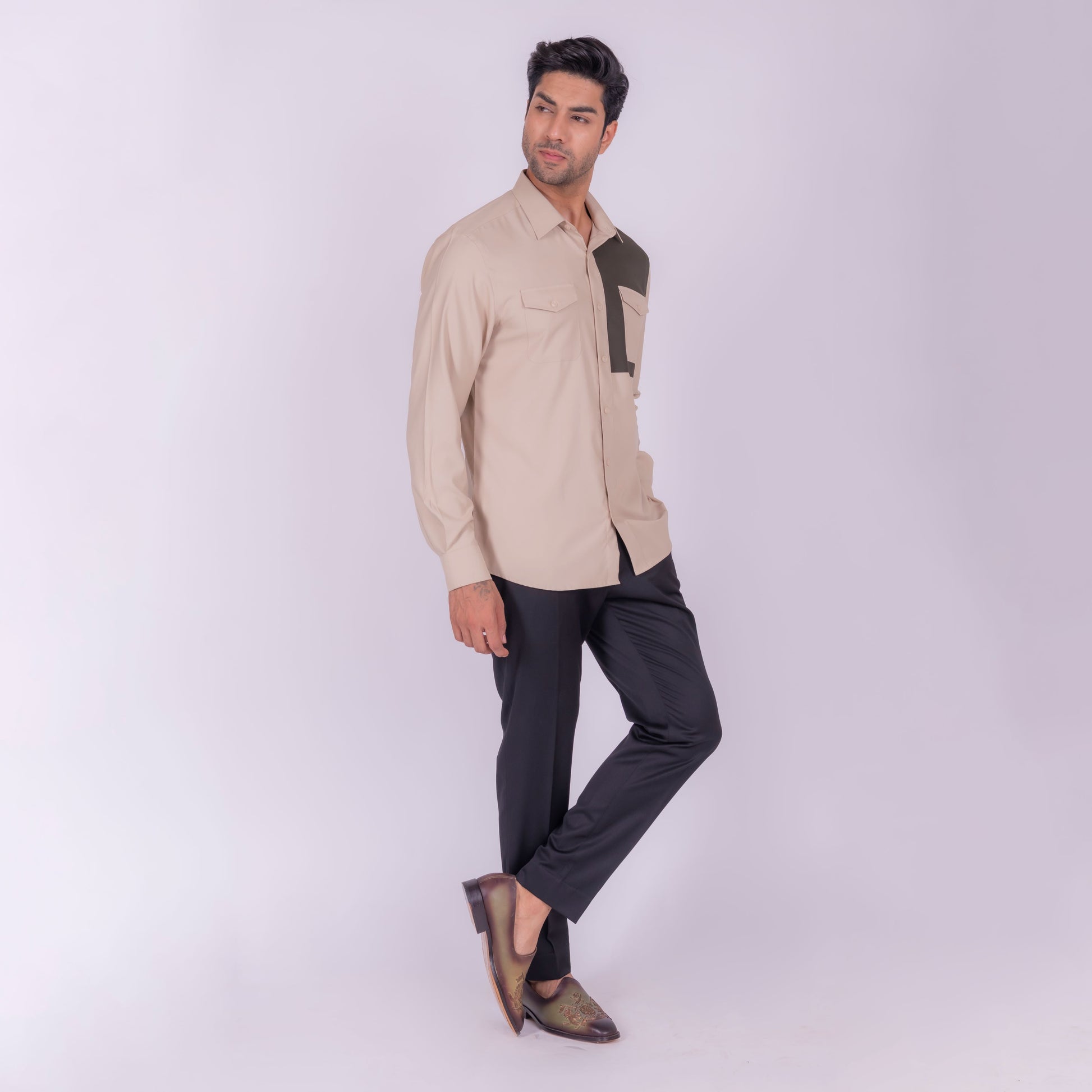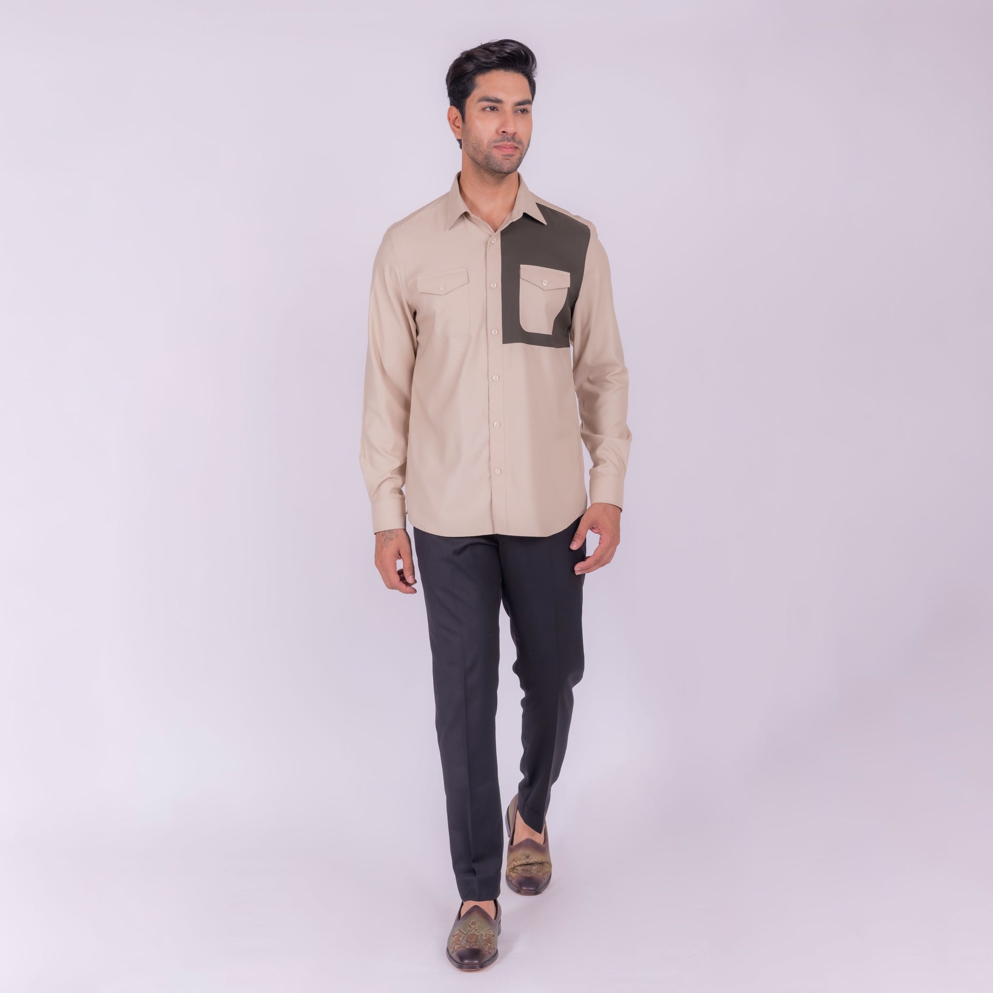 A harmonious blend of earthy tones, this beige shirt with olive green detailing is perfect for those who appreciate a natural and effortless style. The combination of colors creates a soothing and calming visual appeal.