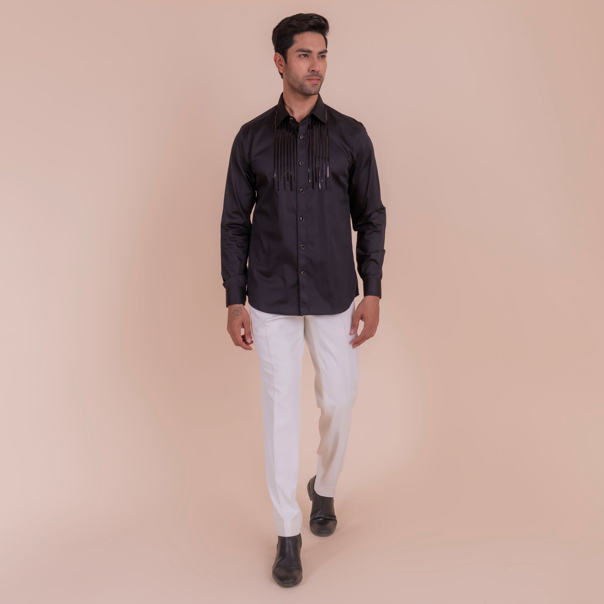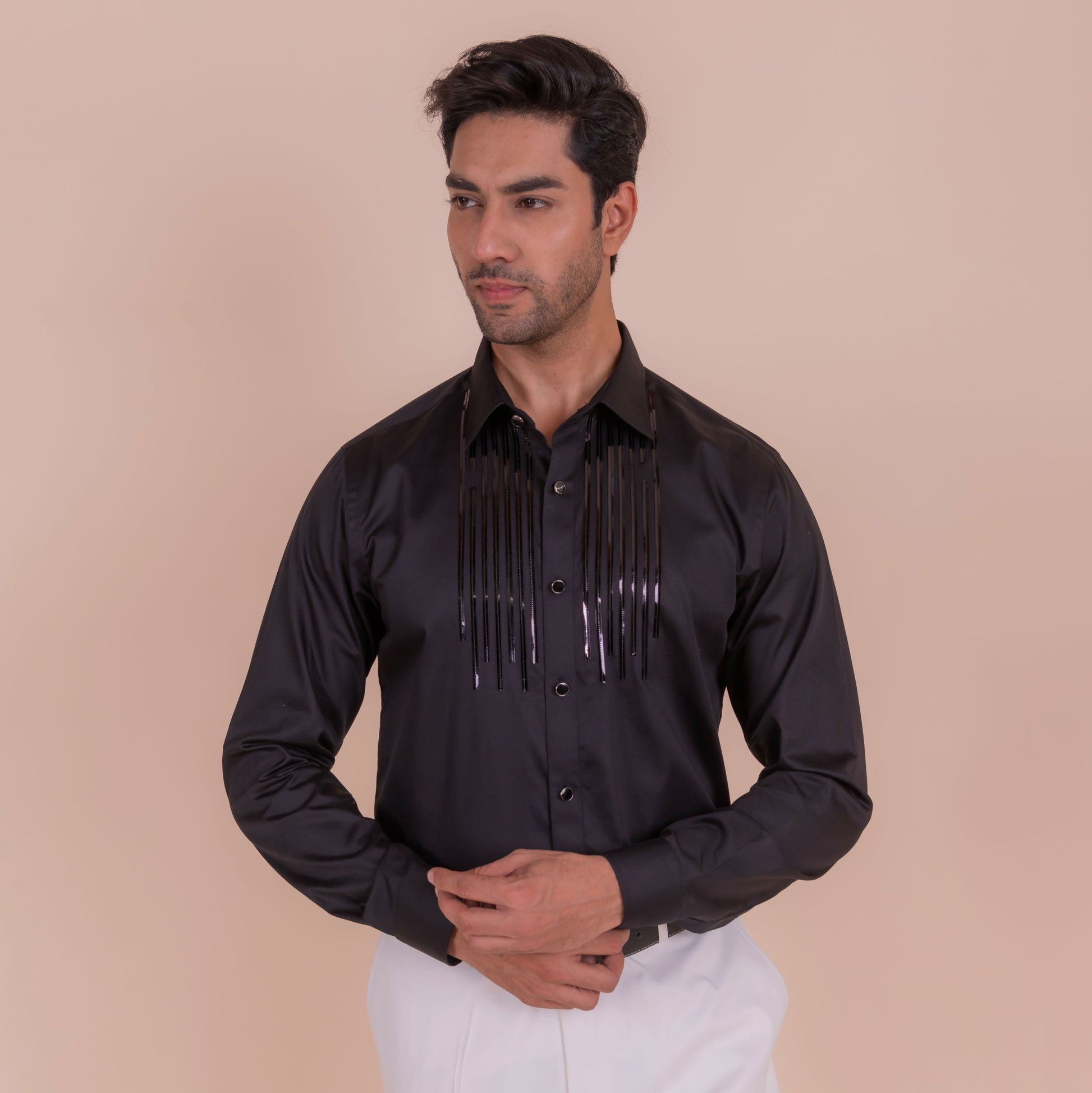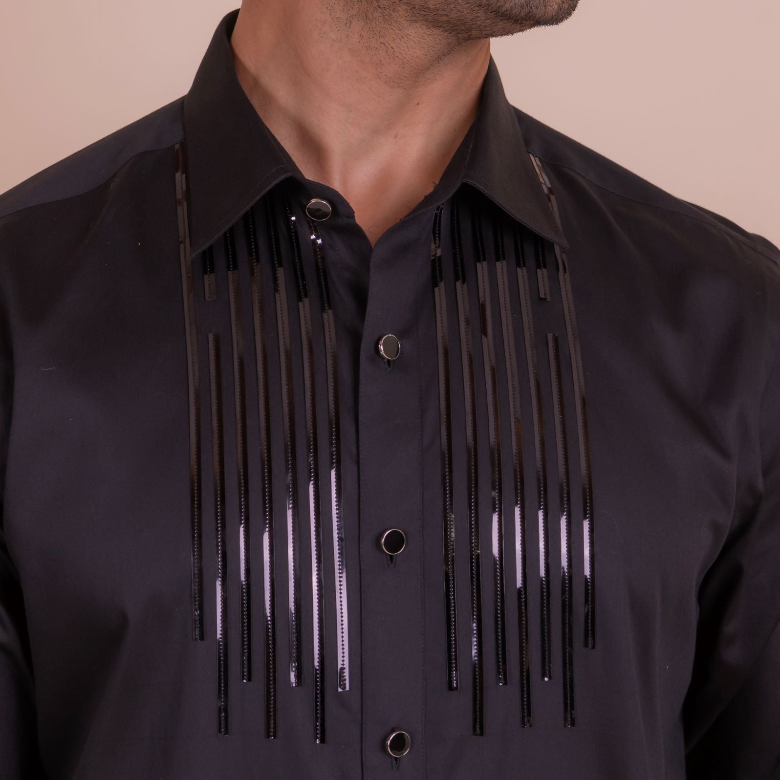 Elevate your style with this sleek black shirt, featuring vertical black tape detailing that adds a touch of sophistication. The slim fit design and premium fabric ensure a comfortable wear.