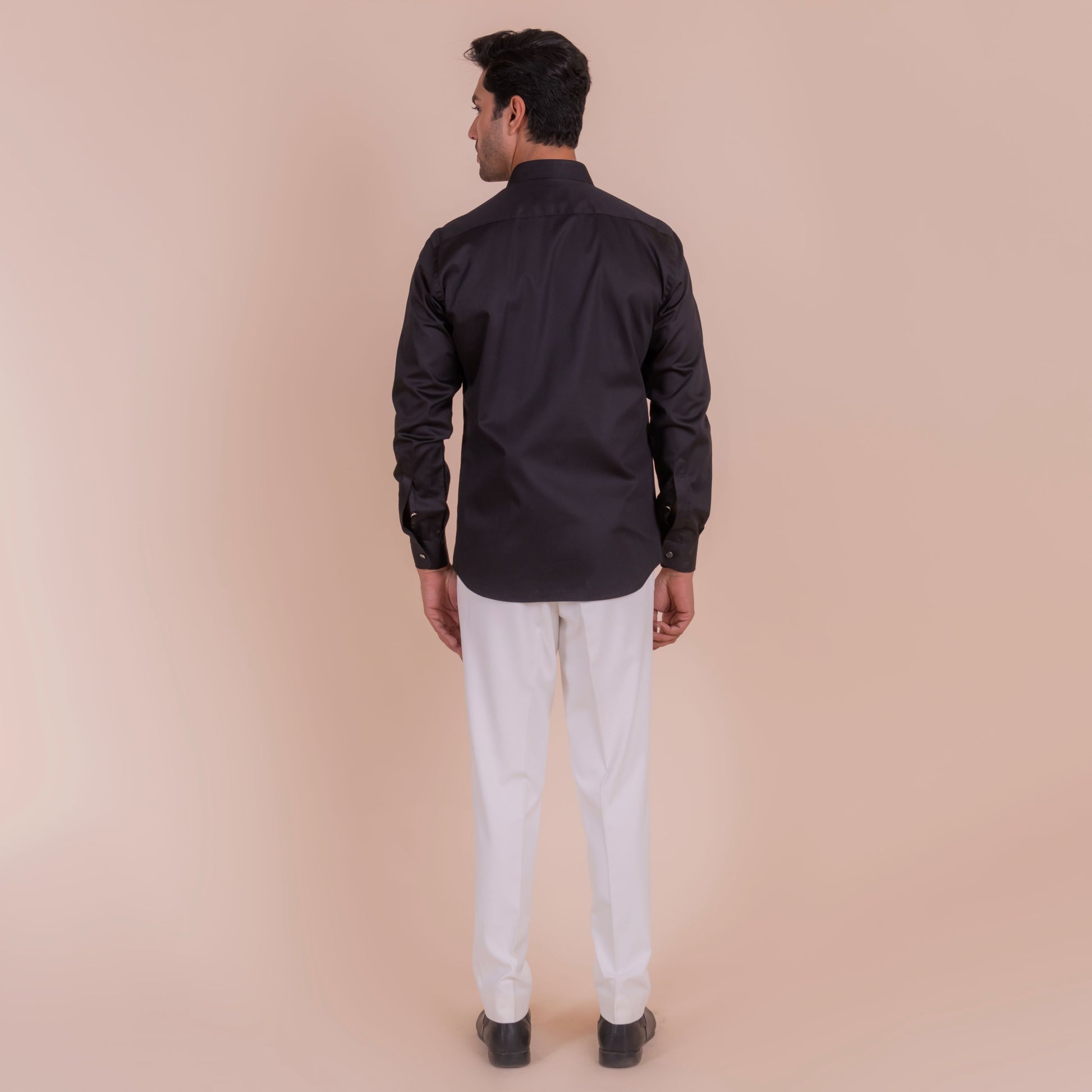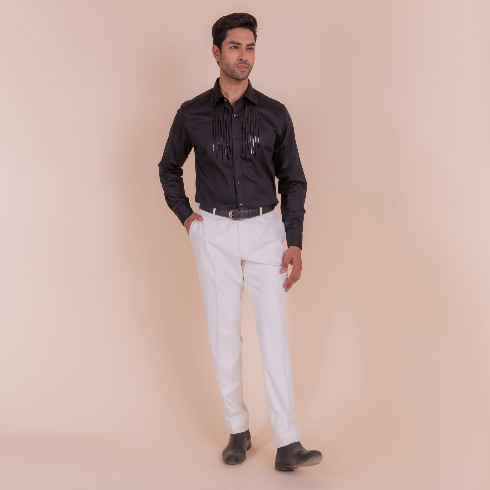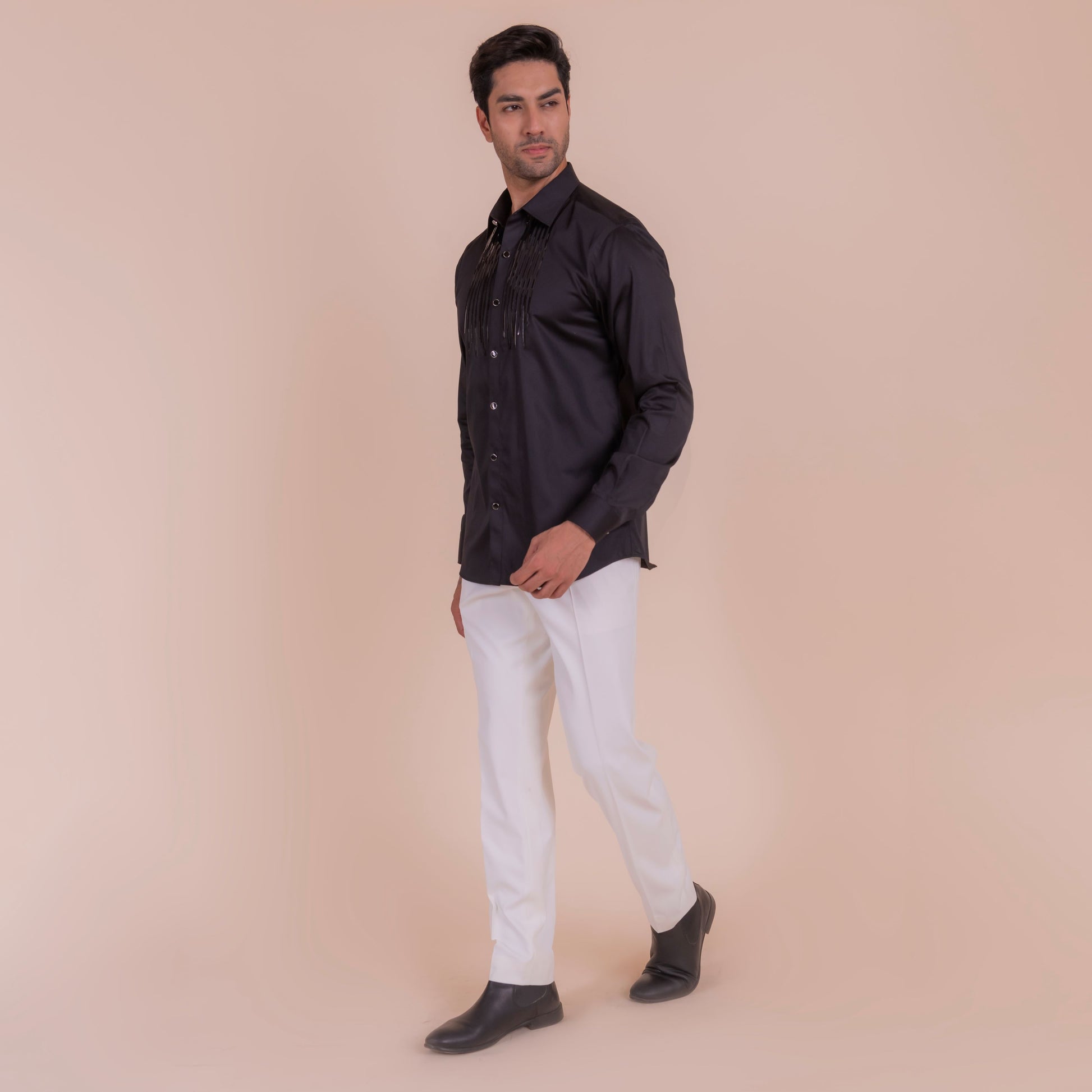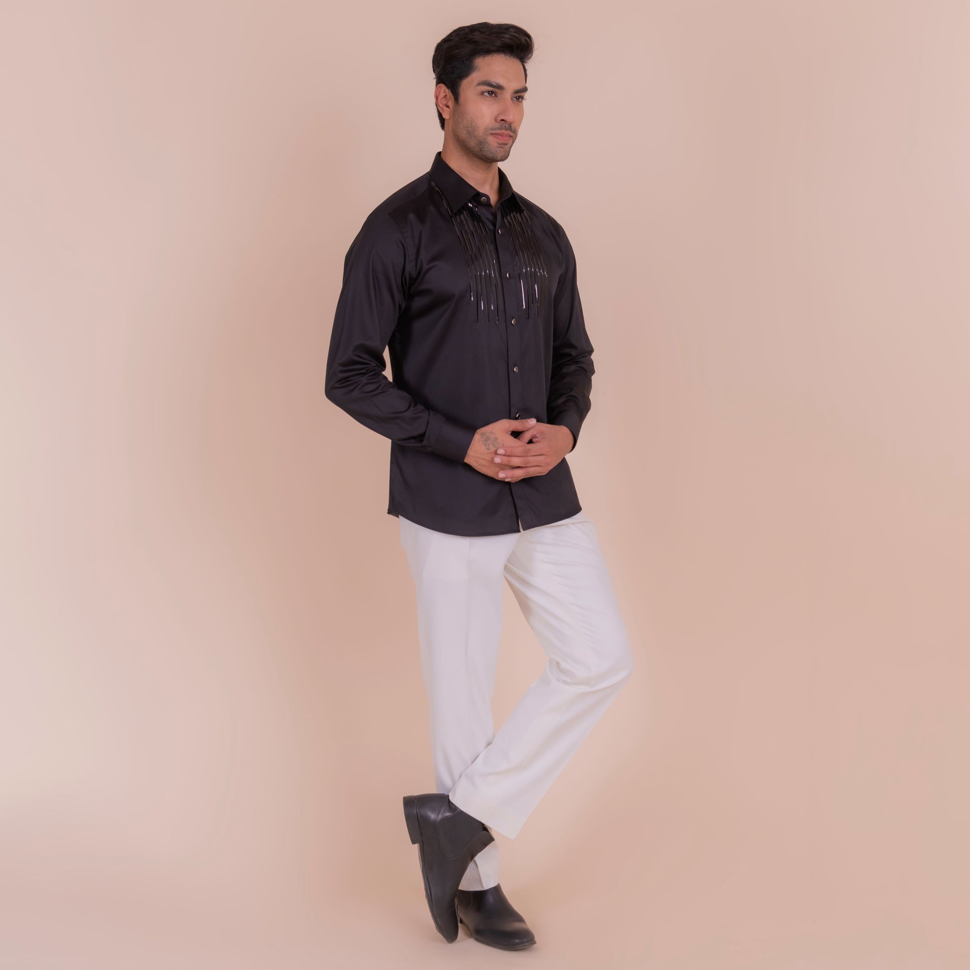 Elevate your style with this sleek black shirt, featuring vertical black tape detailing that adds a touch of sophistication. The slim fit design and premium fabric ensure a comfortable wear.